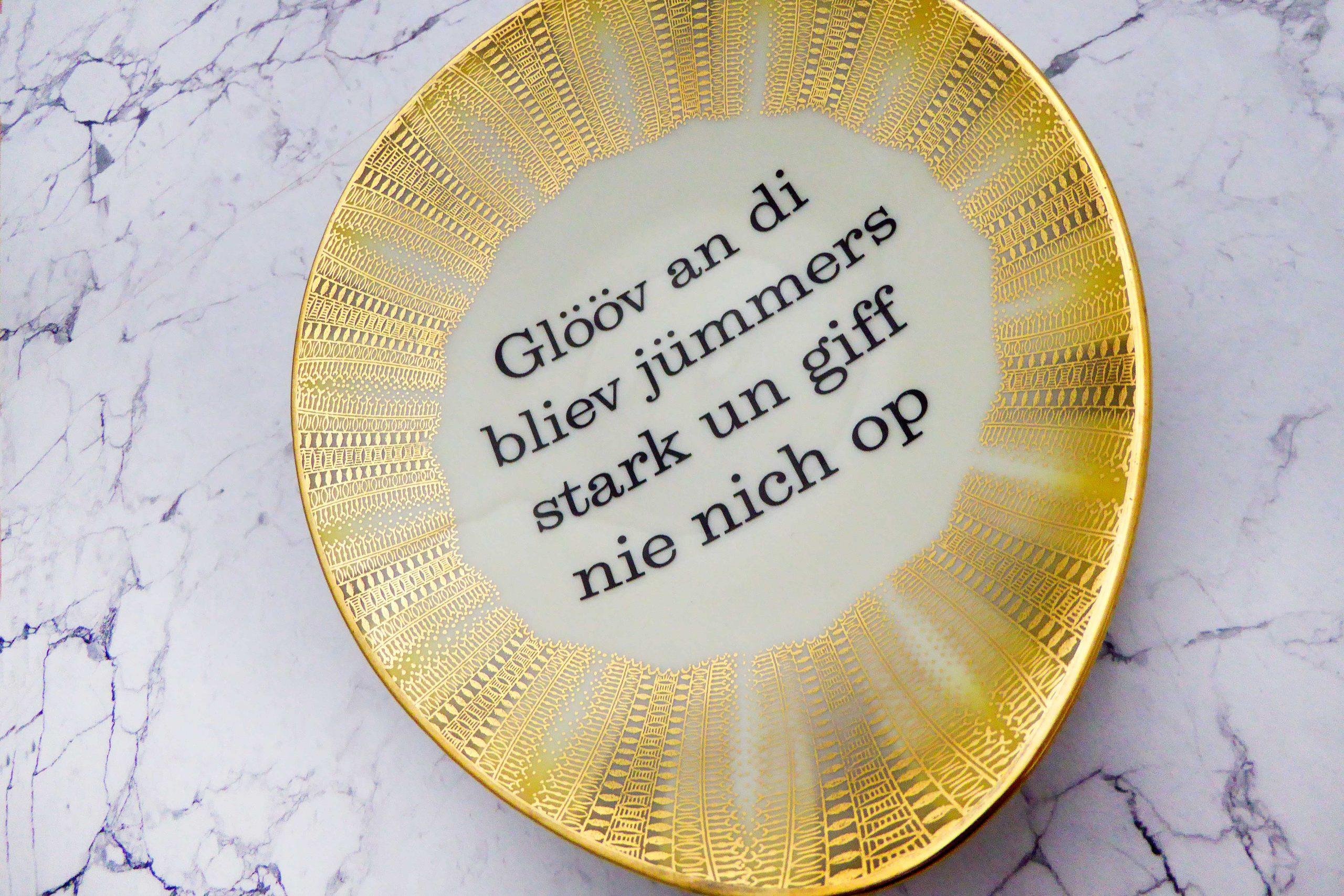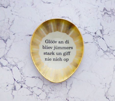 Jeder Wandteller wird handgefertigt und jeder der vintage Teller ist immer wieder ein Einzelstück. Dieser schöne ovale Wandteller hat einen Goldrand, ein gelbes /gold Streifen Muster und mit unserer Typo Glööv an di kann er für alle Dekozwecke genutz werden.