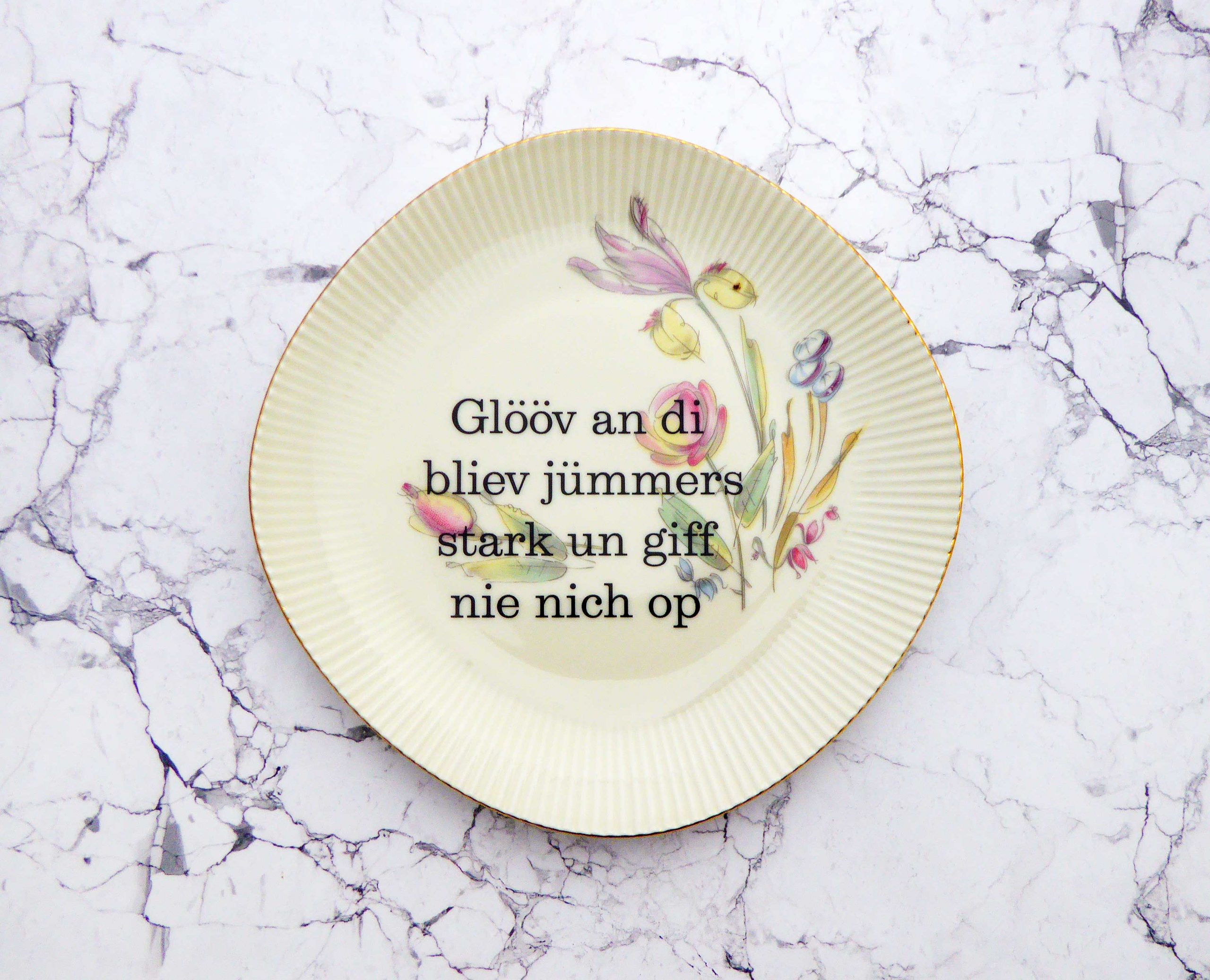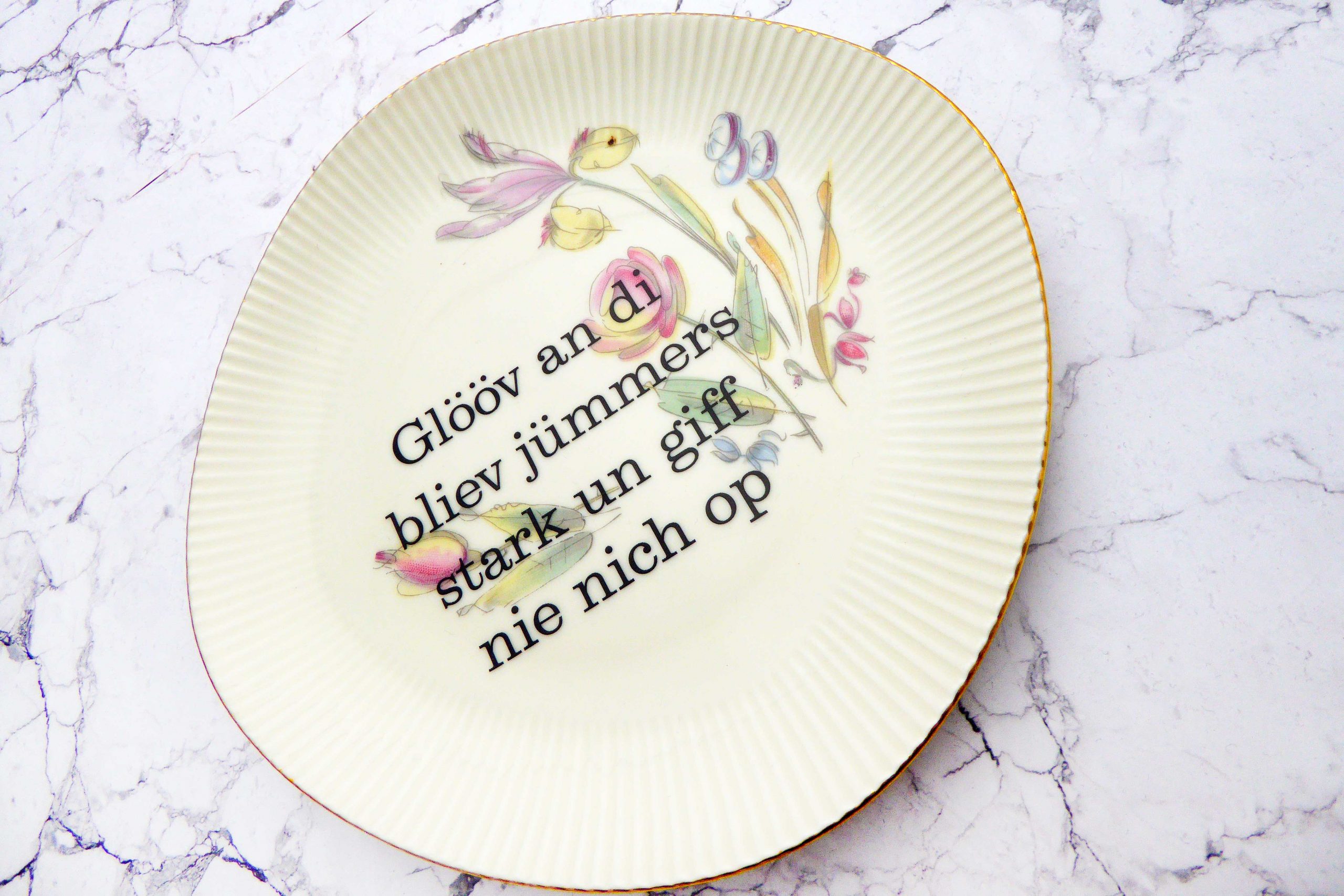 Wandteller Typo Glööv an di vintage Herr Fuchs Teller Gold plattdeutsch Blume 19cm eckig