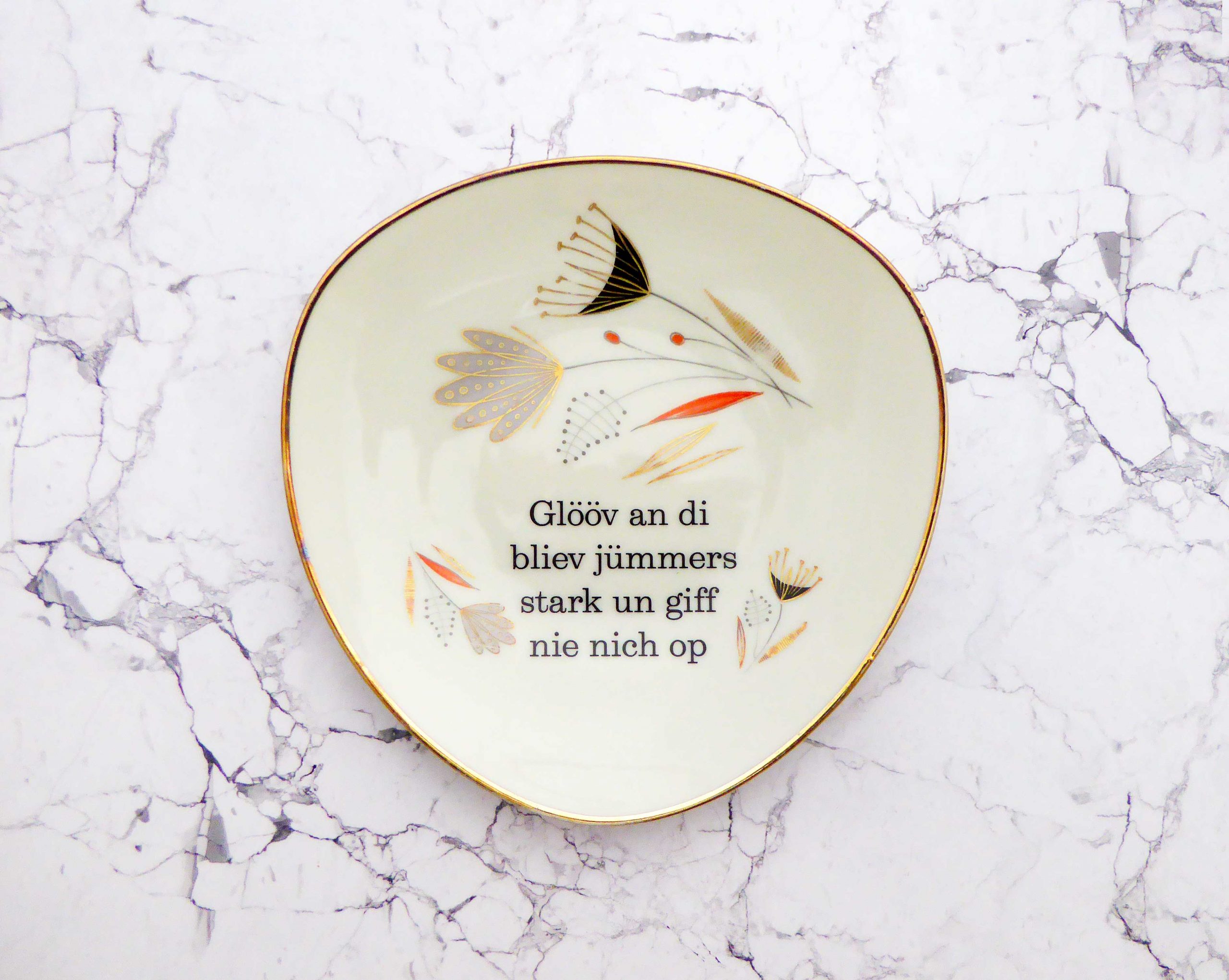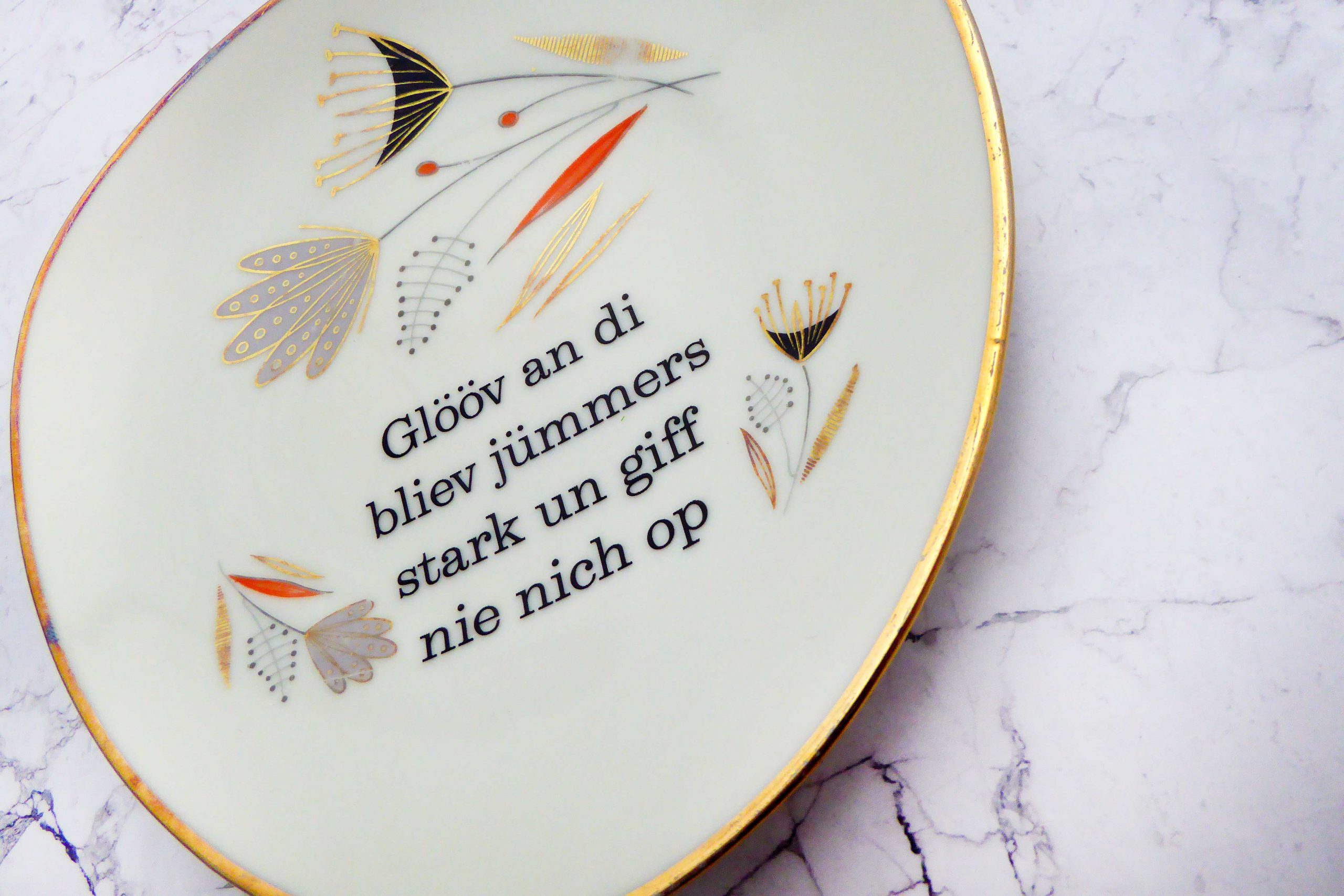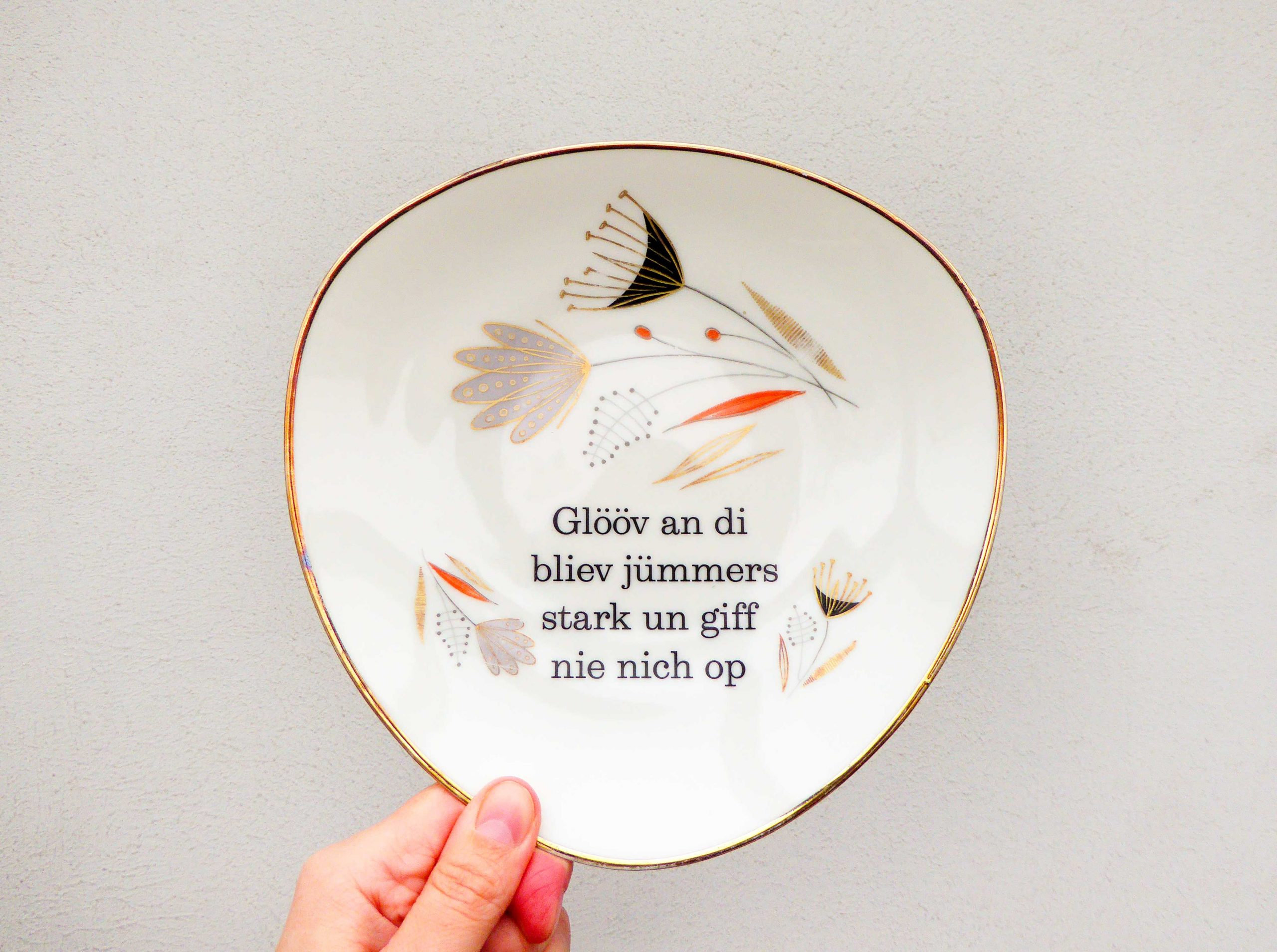 Jeder Wandteller wird handgefertigt und jeder der vintage Teller ist immer wieder ein Einzelstück. Dieser schöne Wandteller hat eine Goldrand mit Blumen Muster und hat ein besonderes Punkte Decor. Mit unserer Typo Glööv an di kann er für alle Dekozwecke genutz werden.