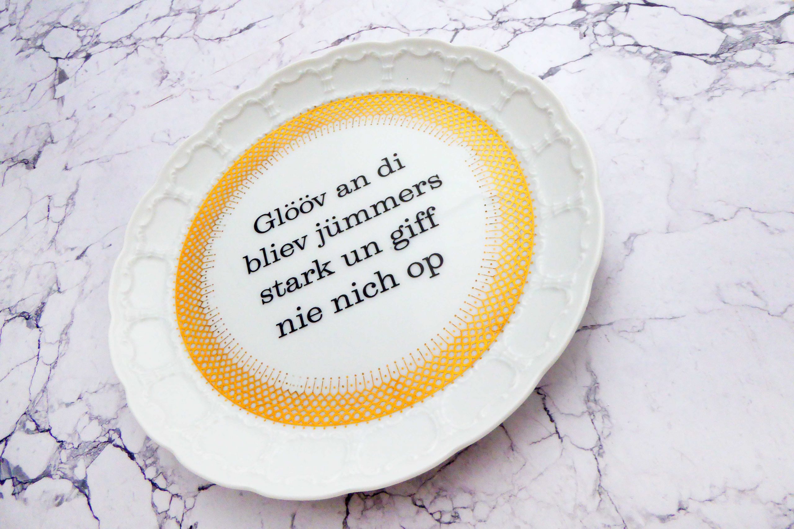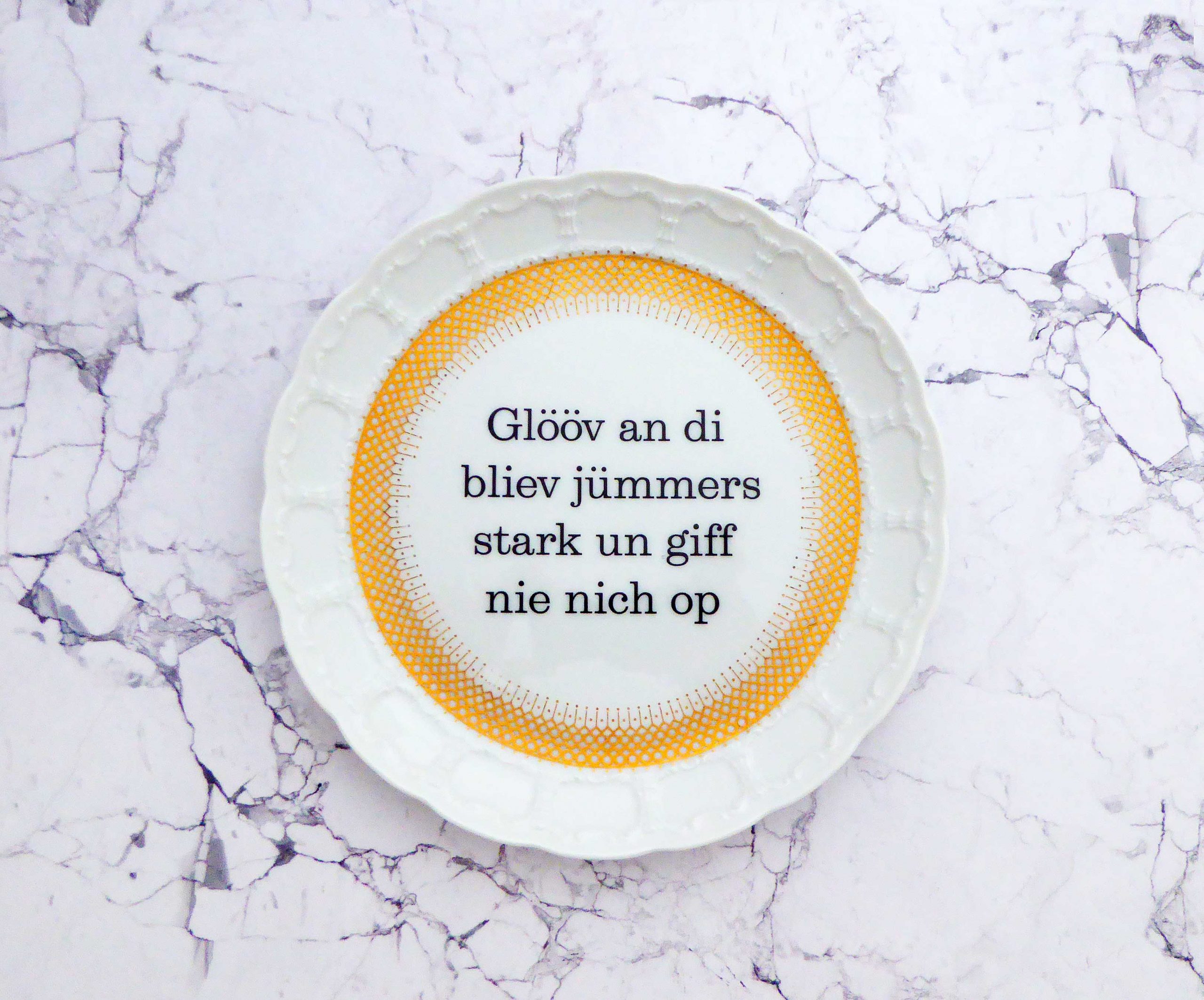 Wandteller Typo Glööv an di vintage Herr Fuchs Teller Muster plattdeutsch gold 19cm