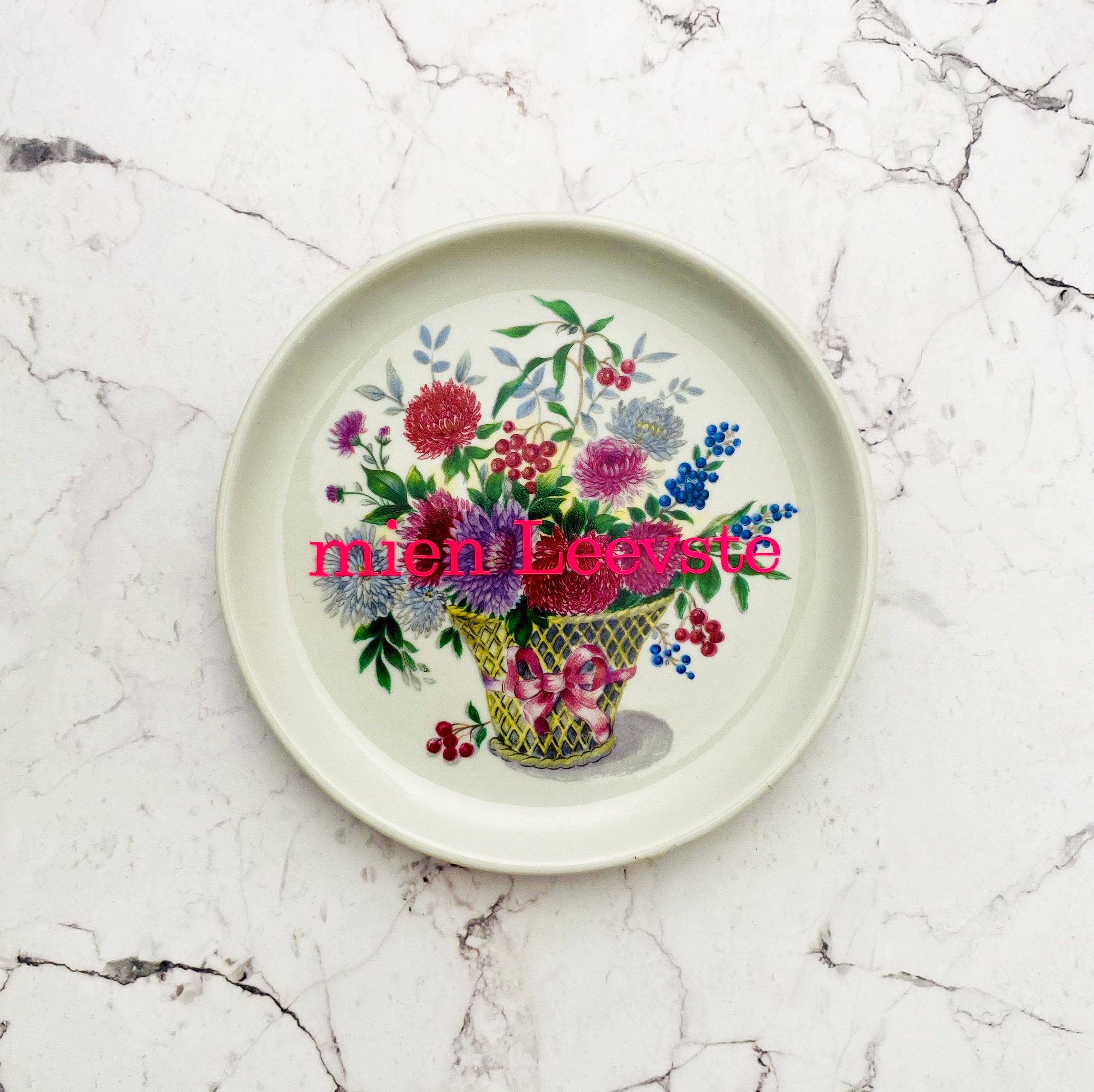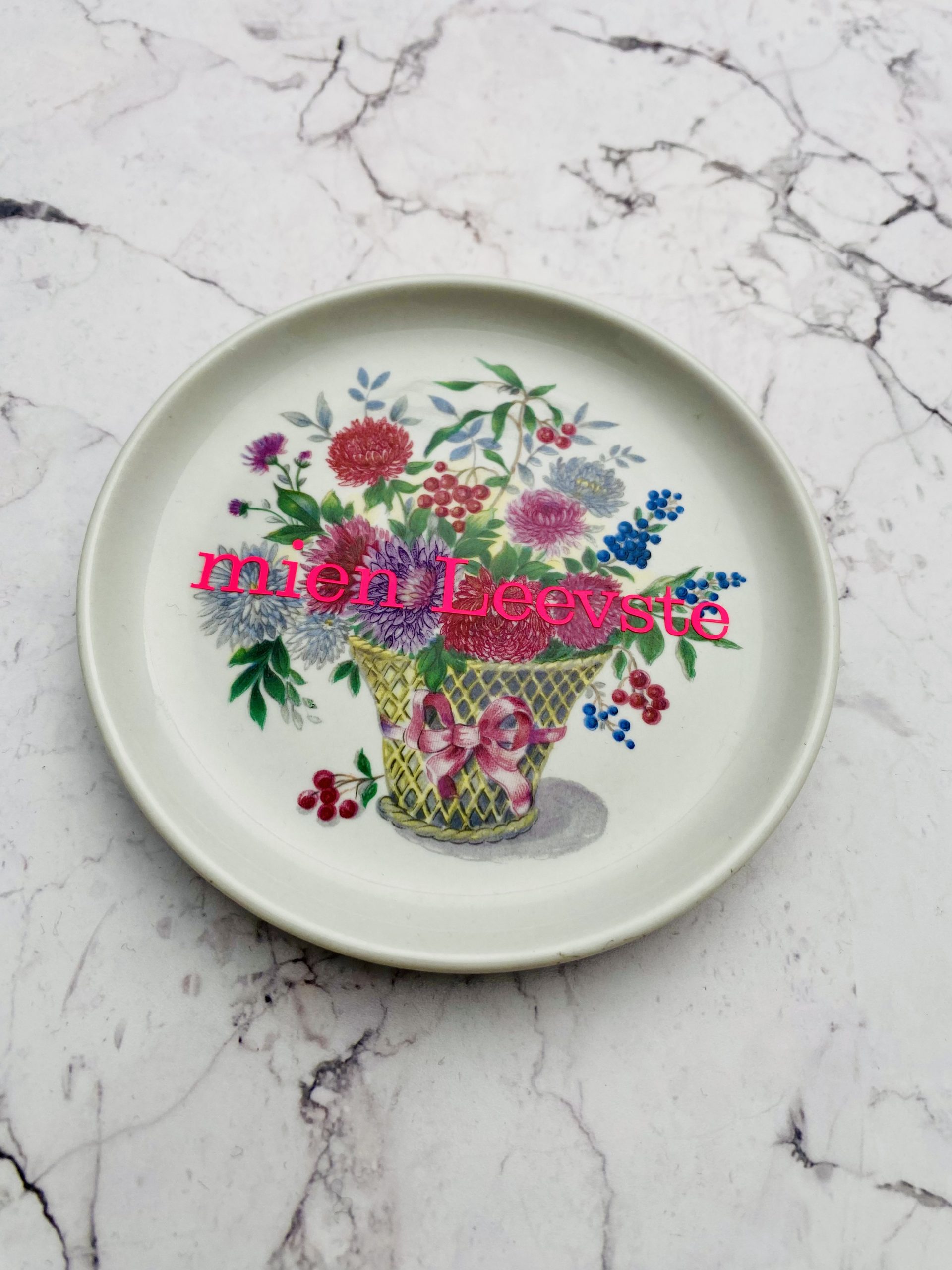 Dieser schöne Wandteller hat ein besonderes buntes Blumendecor und mit unserer mien leevste Typo in neonpink ( super knallig, deutlich mehr als wir auf den Fotos abbilden können :)kann er für alle Dekozwecke genutz werden.