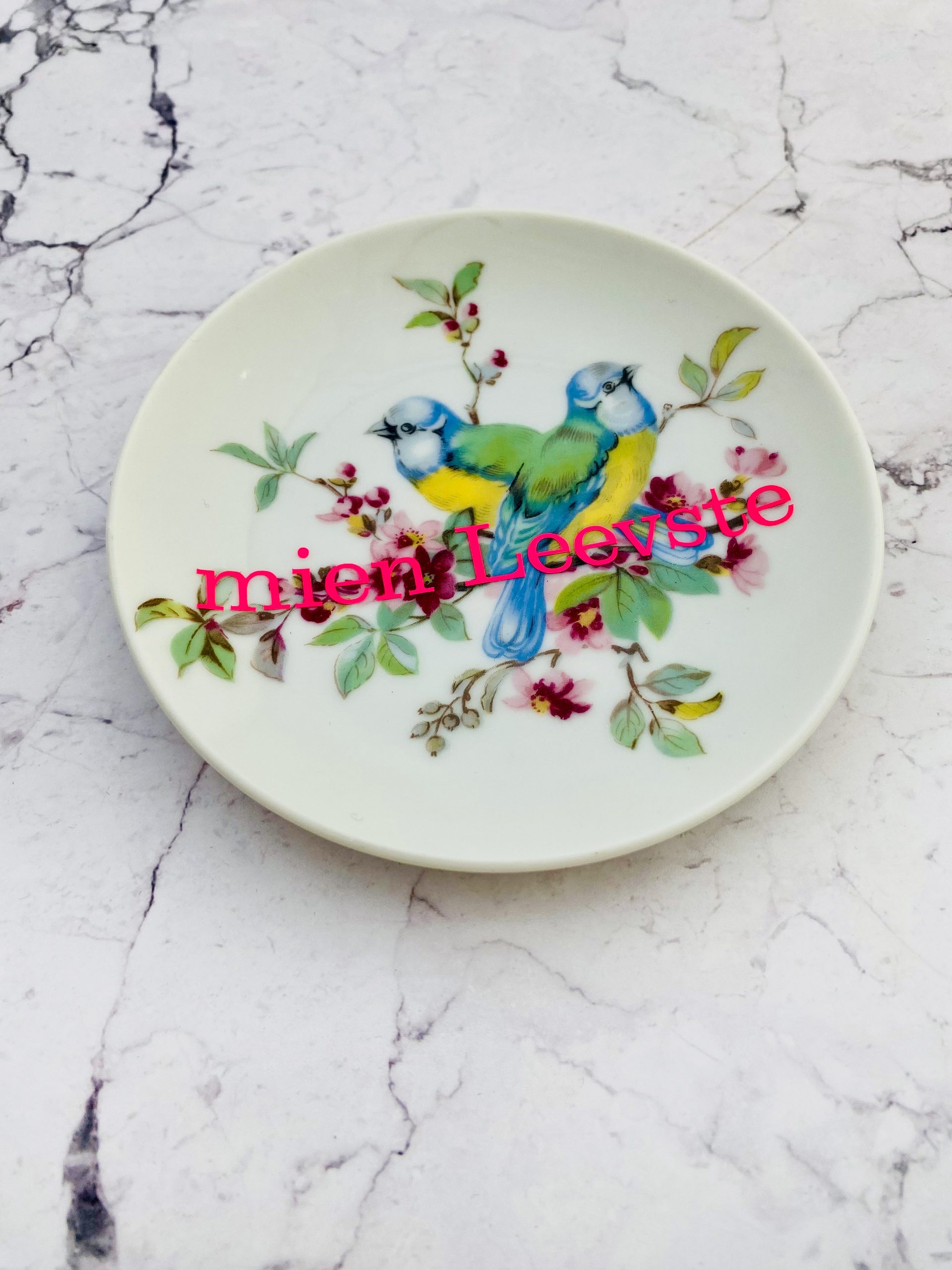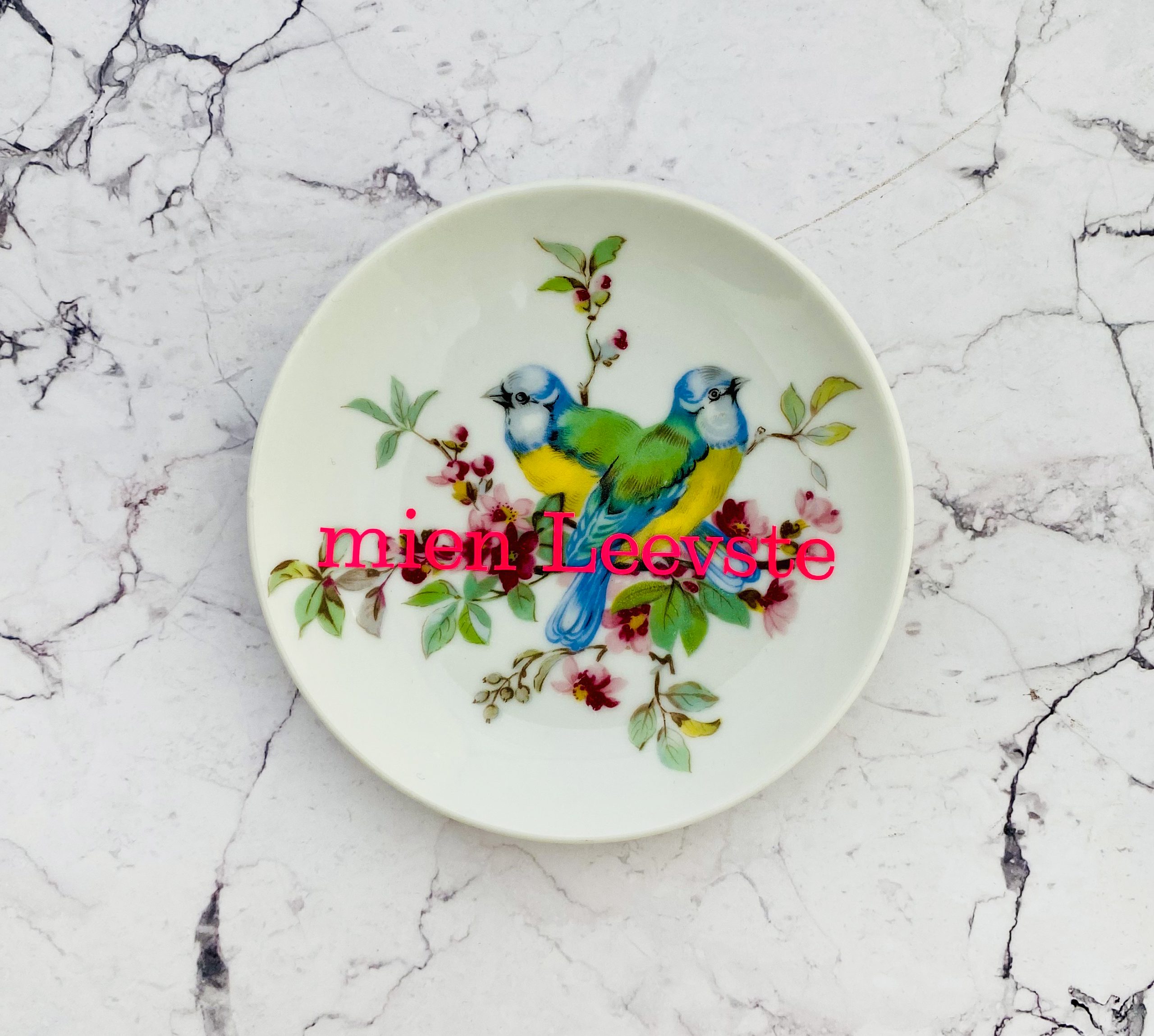 Dieser schöne Wandteller hat ein besonderes buntes Vögeldecor und mit unserer mien leevste Typo in neonpink ( super knallig, deutlich mehr als wir auf den Fotos abbilden können :)kann er für alle Dekozwecke genutz werden.