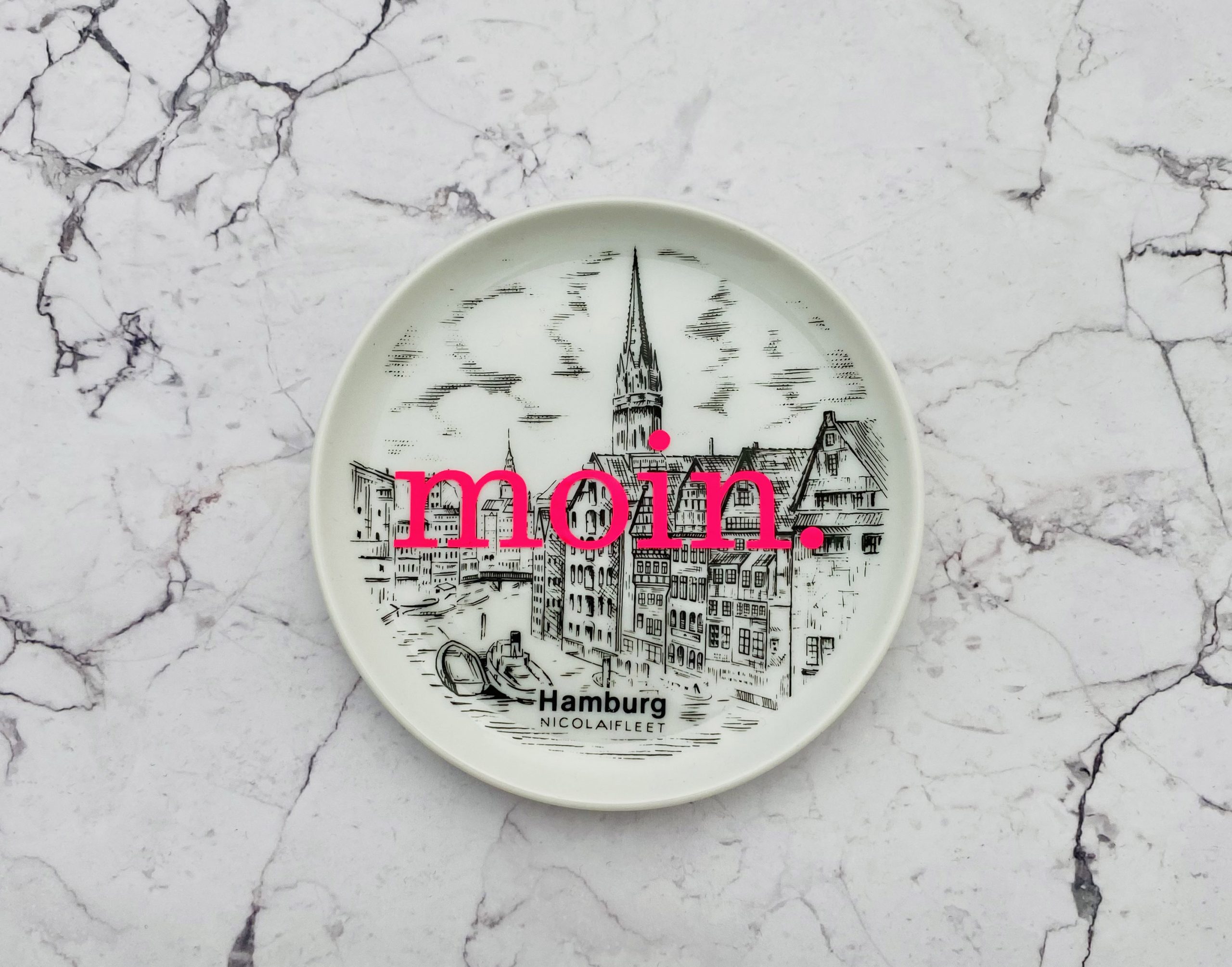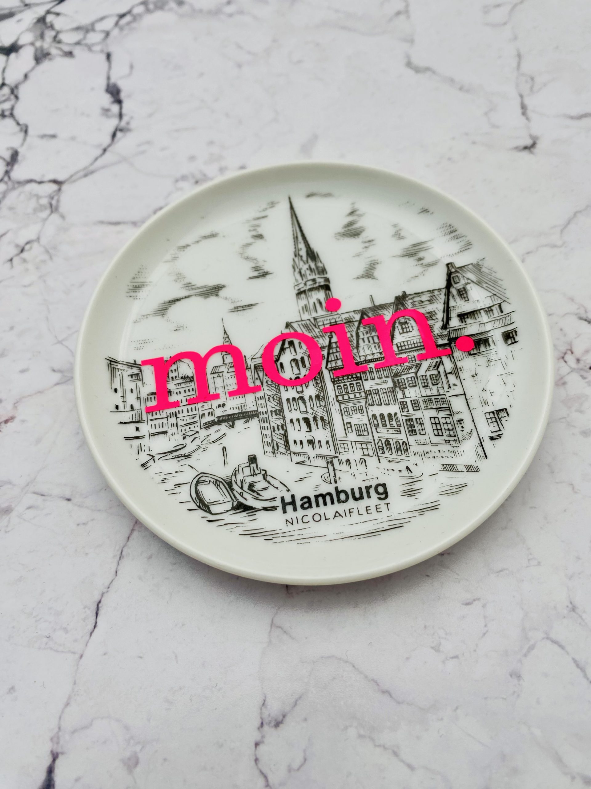Dieser schöne Wandteller hat ein besonderes Nicolaifleet Decor und mit unserer moin. Typo in neonpink ( super knallig, deutlich mehr als wir auf den Fotos abbilden können :)kann er für alle Dekozwecke genutz werden.
