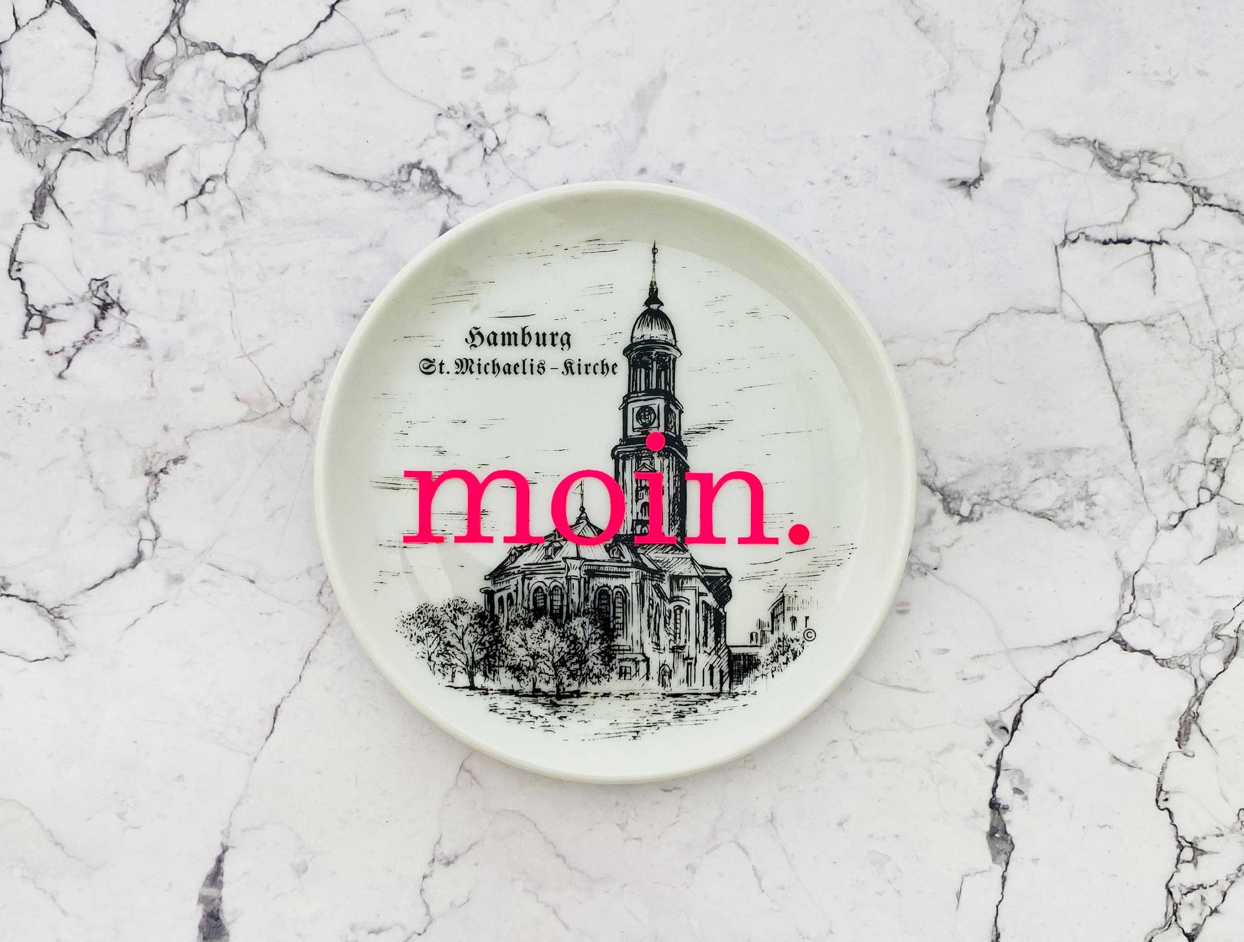Dieser schöne Wandteller hat ein besonderes historisches Hamburg / Michel Decor und mit unserer moin. Typo in neonpink ( super knallig, deutlich mehr als wir auf den Fotos abbilden können :)kann er für alle Dekozwecke genutz werden.