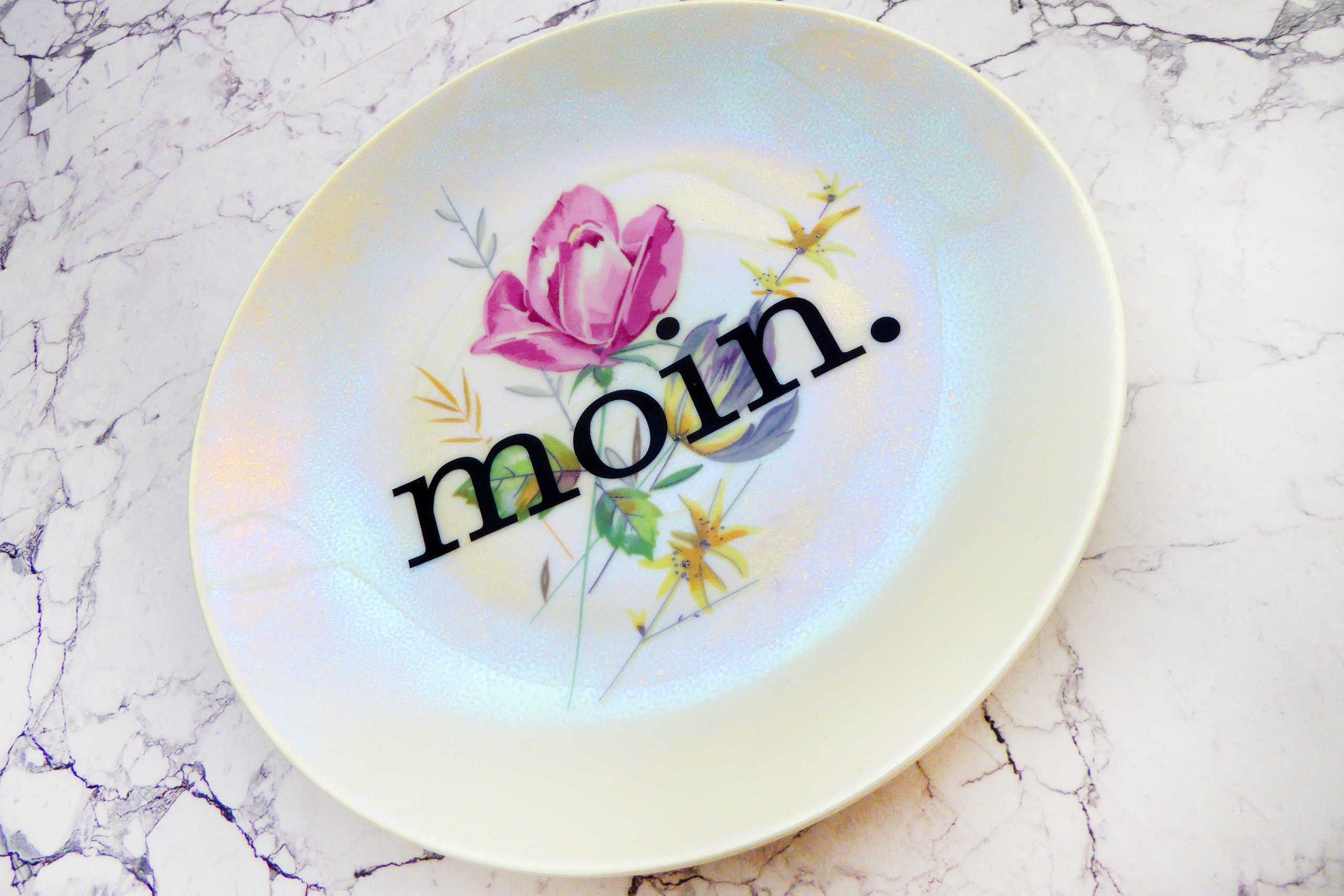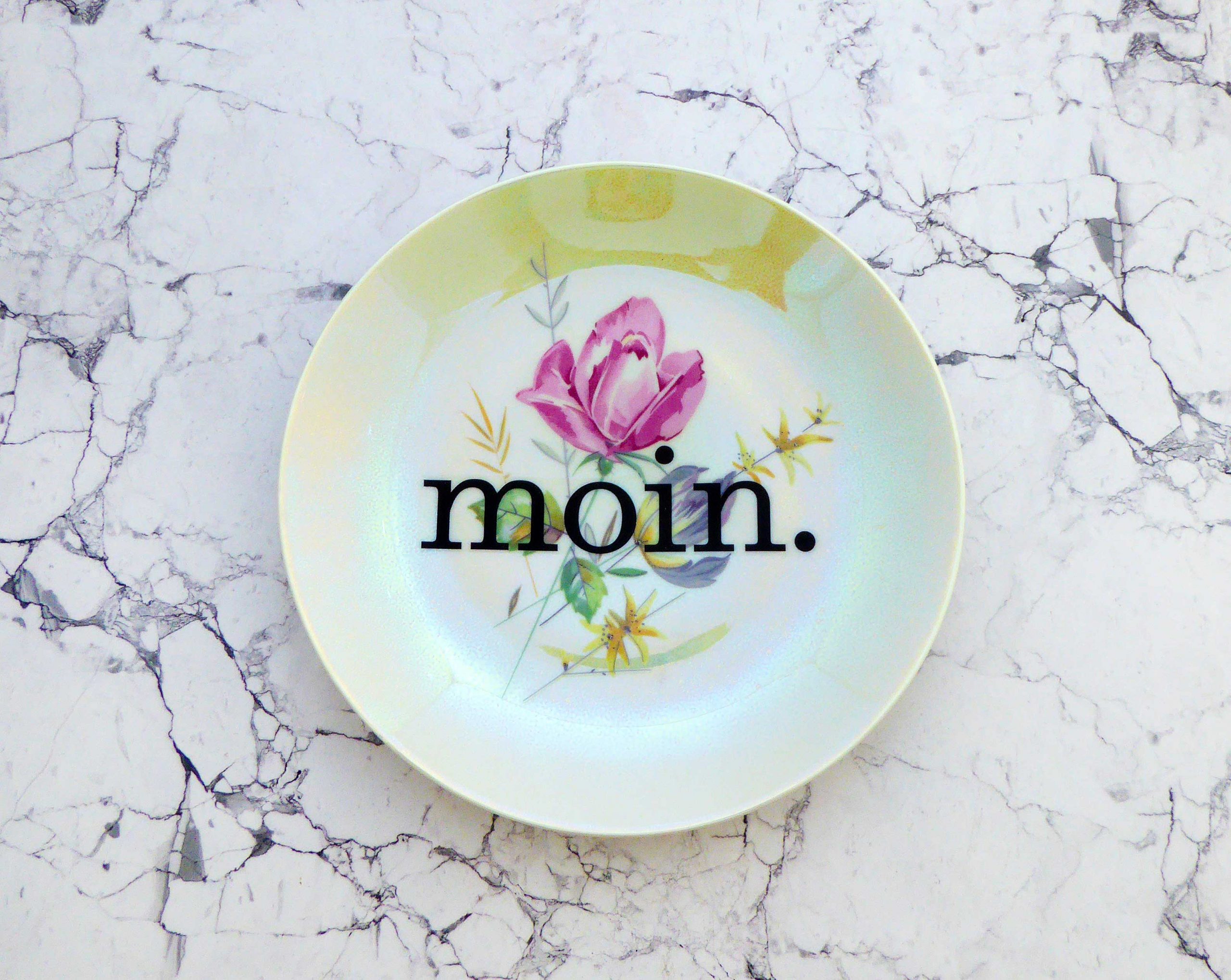 Unser Vintage Wandteller mit unserer Typo moin. ist ein besonderes Stück für Deine Wand.