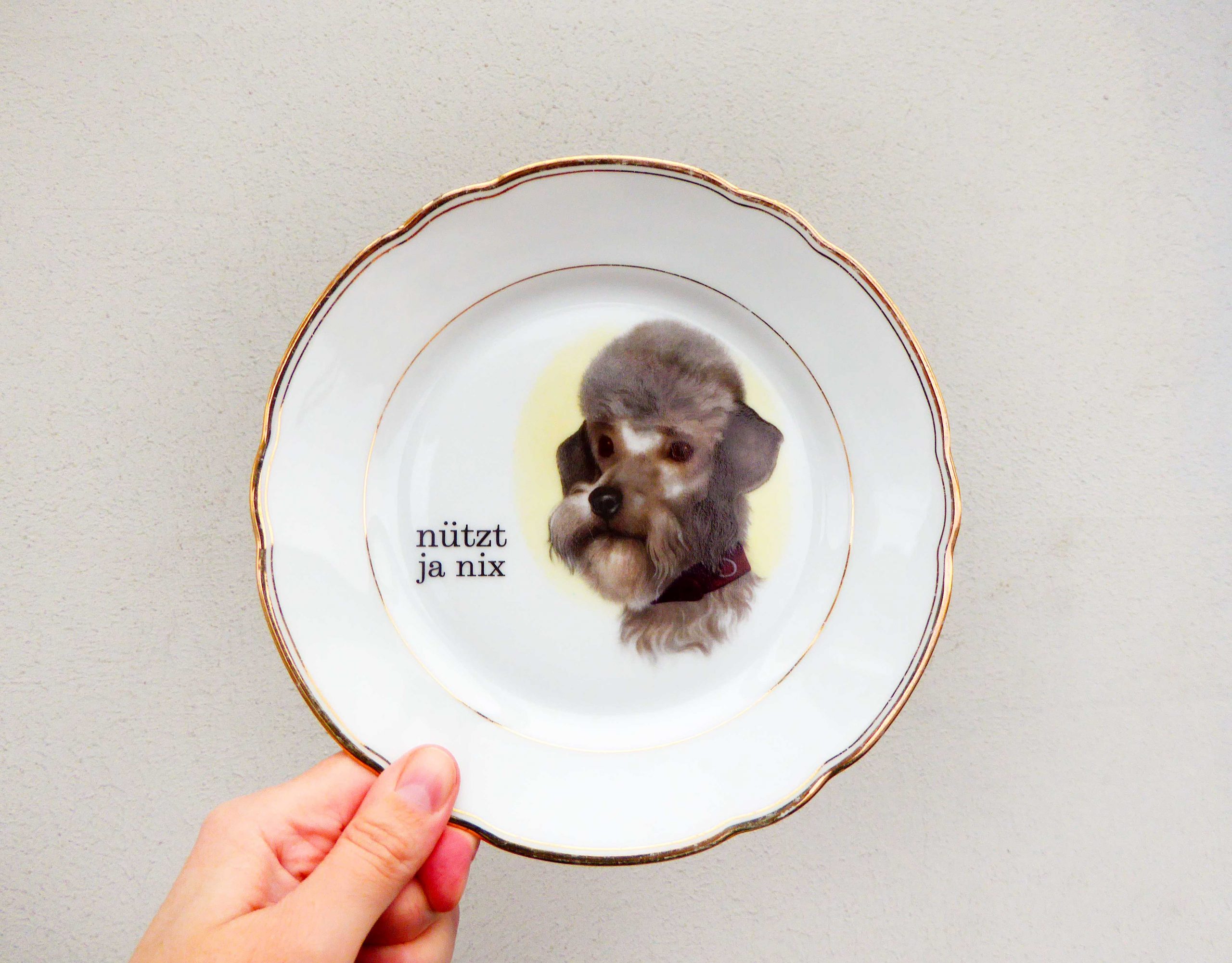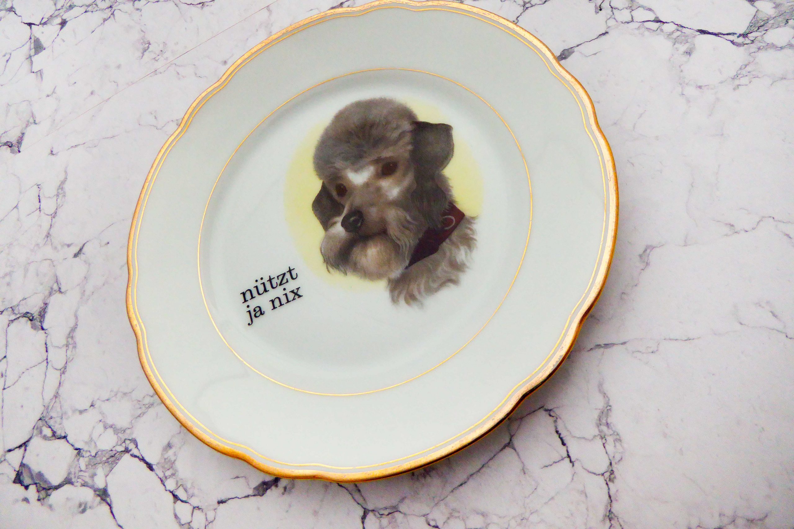 Jeder Wandteller wird handgefertigt und jeder der vintage Teller ist immer wieder ein Einzelstück. Dieser besondere Wandteller hat ein schönes Pudel/Hunde Decor mit Goldrand und mit unserer Typo nützt ja nix kann er für alle Dekozwecke genutz werden.