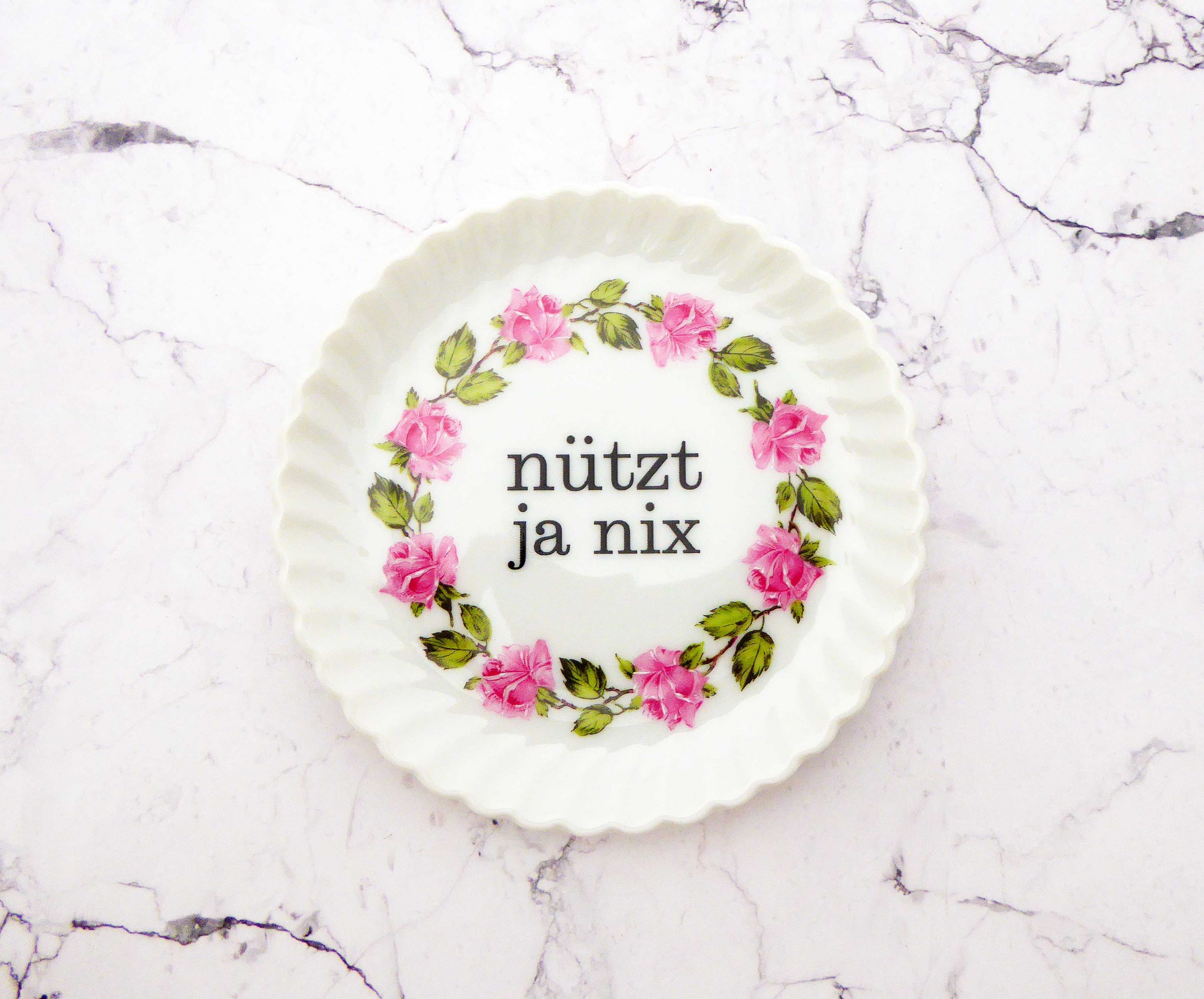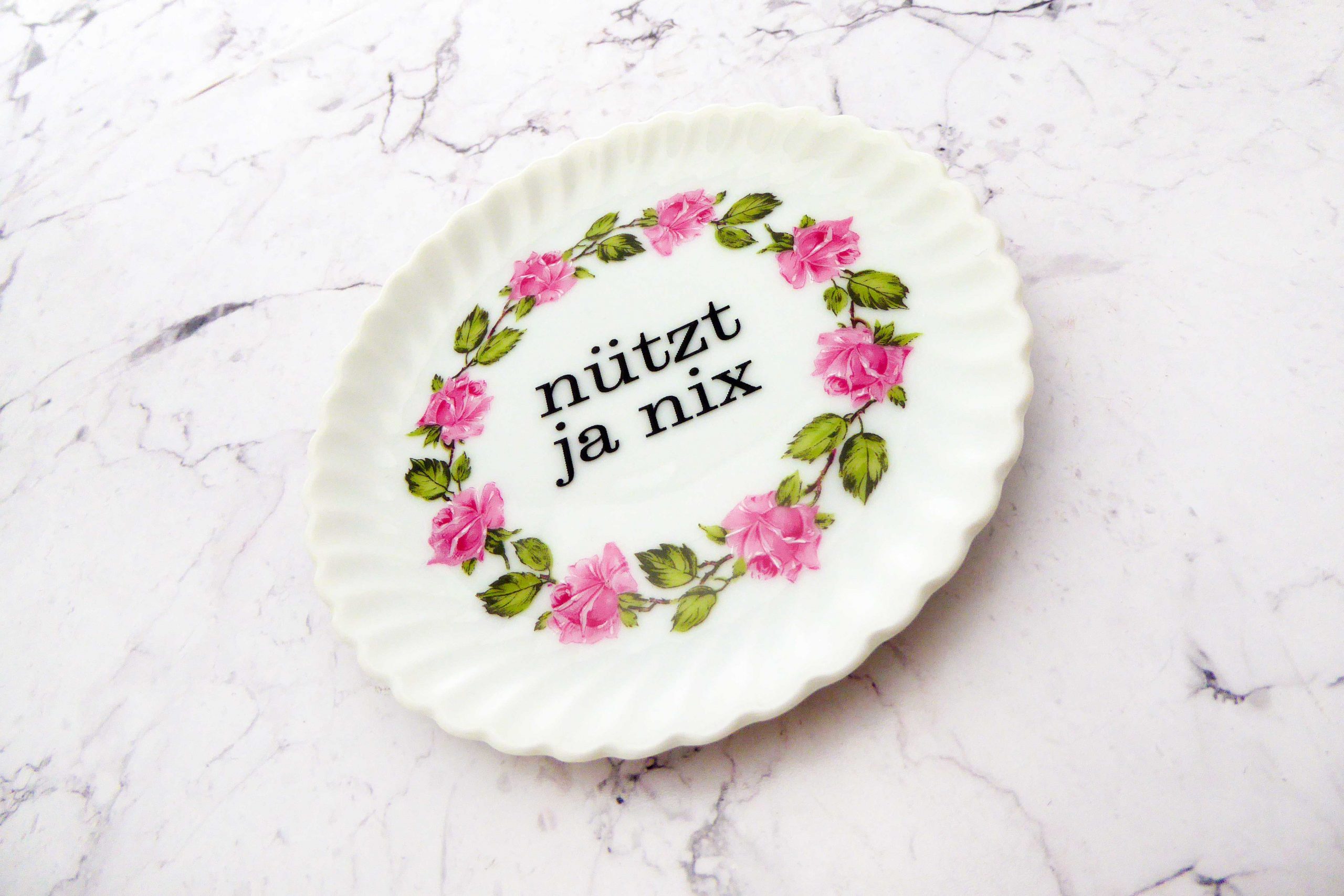 Unser vintage Wandteller mit unser nützt ja nix Typo ist ein besonderes Stück für Dein Zuhause.