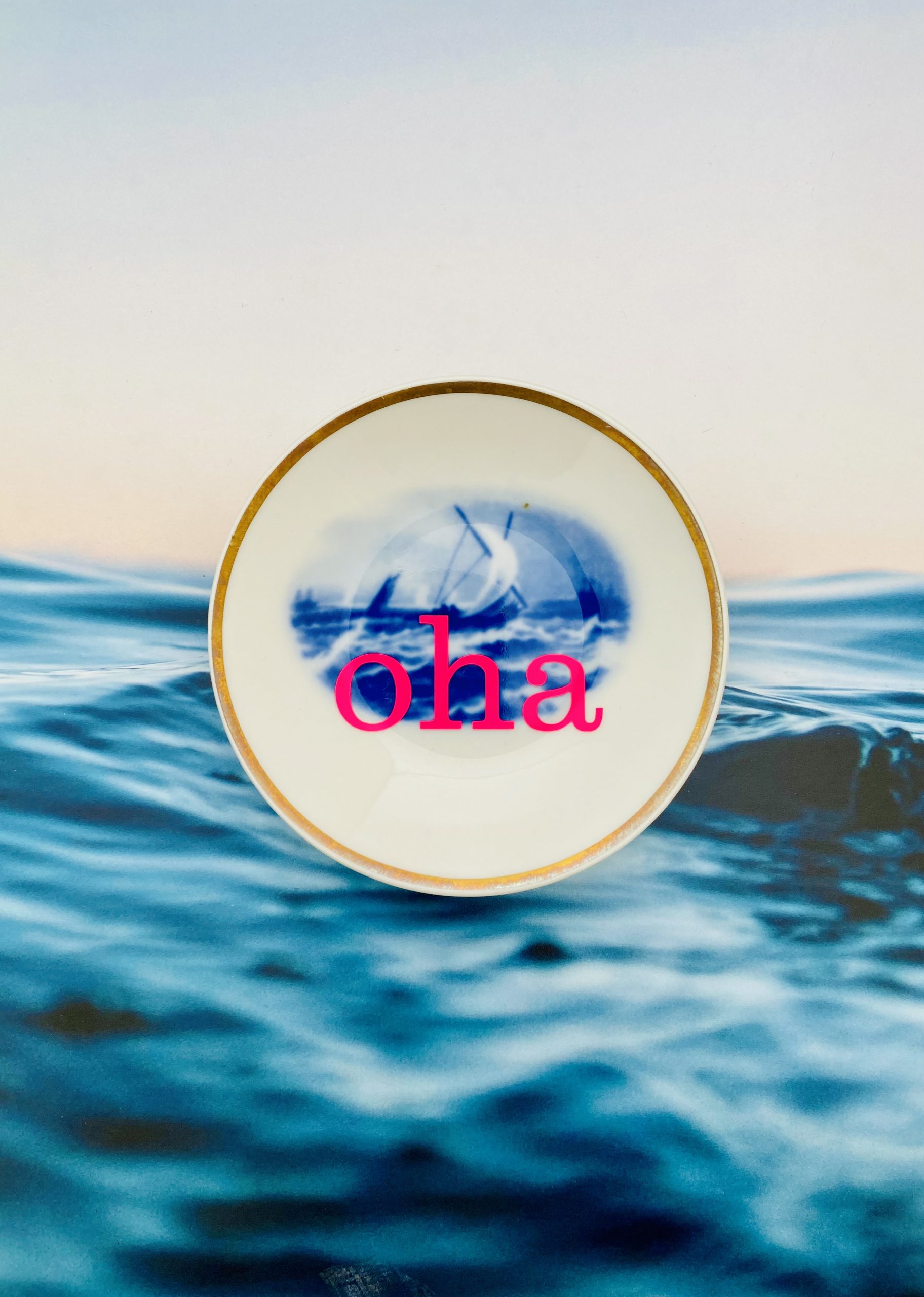 Dieser schöne Wandteller hat ein besonderes blaues Schiffdecor und mit unserer oha Typo in neonpink ( super knallig, deutlich mehr als wir auf den Fotos abbilden können :)kann er für alle Dekozwecke genutz werden.