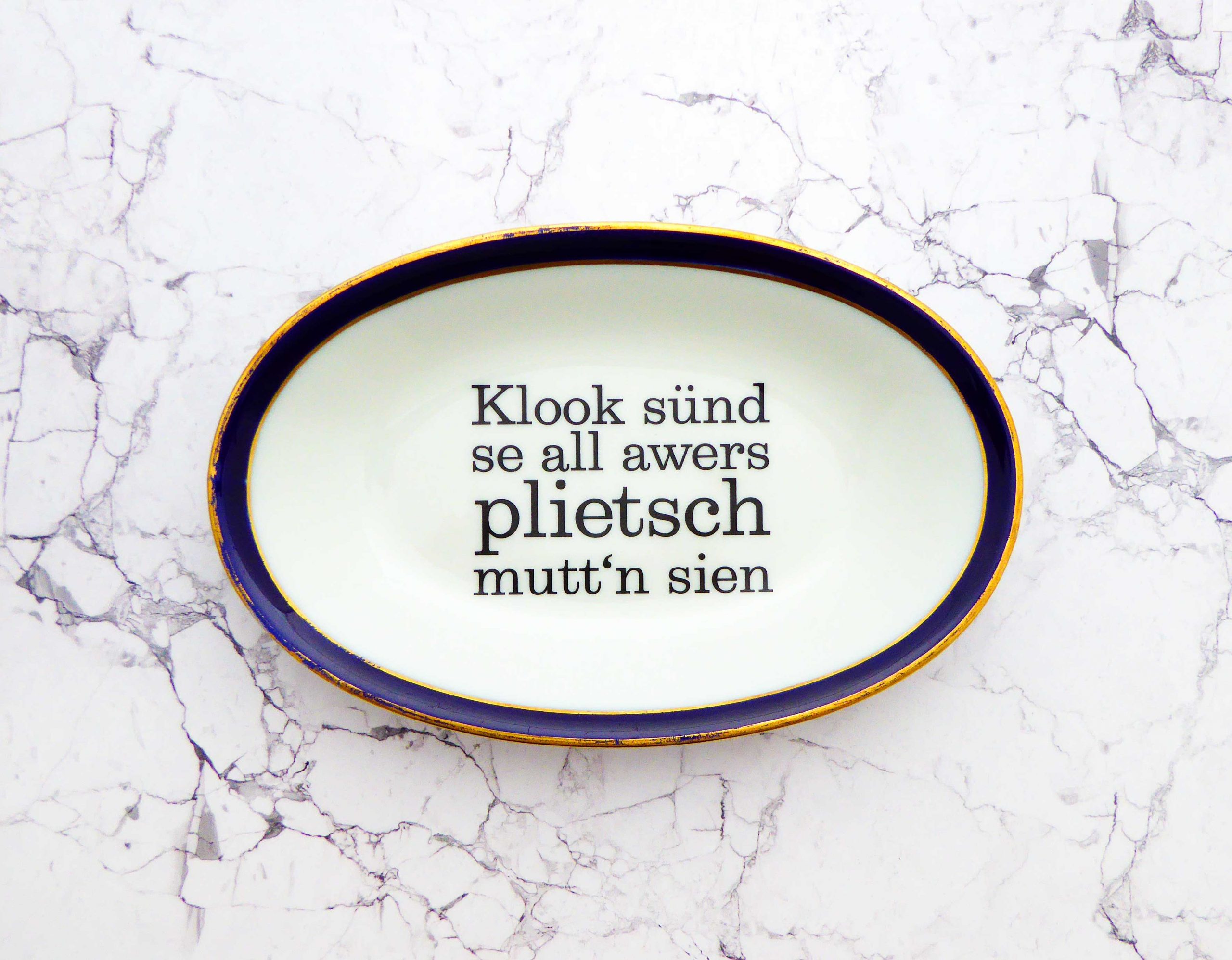 Jeder Wandteller wird handgefertigt und jeder der vintage Teller ist immer wieder ein Einzelstück. Diese besondere Wandteller hat einen schönen Gold/Blau Rand und mit unserer Typo plietsch kann er für alle Dekozwecke genutz werden.