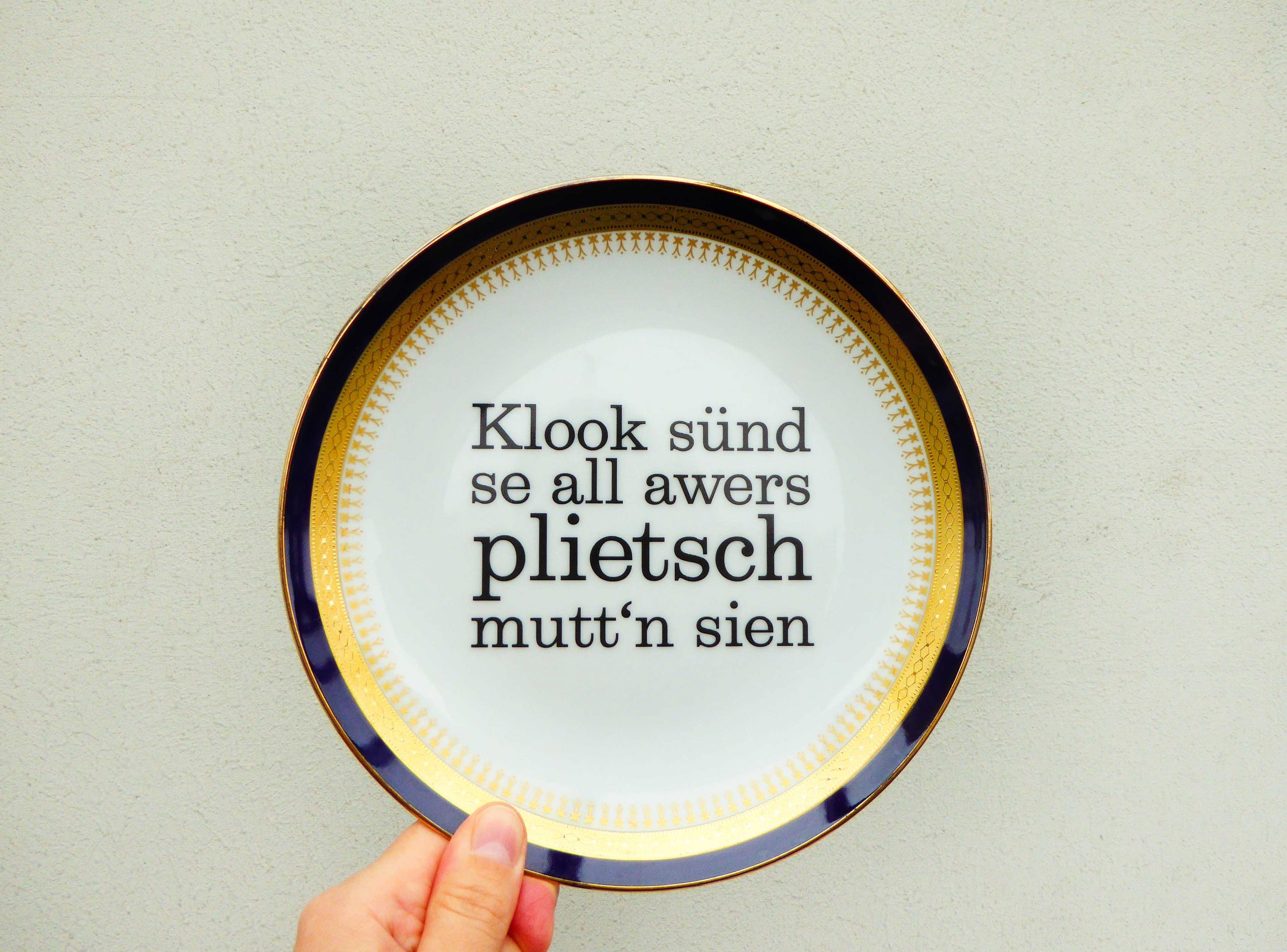 Jeder Wandteller wird handgefertigt und jeder der vintage Teller ist immer wieder ein Einzelstück. Dieser besondere Wandteller hat einen schönen Blau/Goldrand mit Muster. Mit unserer Typo plietsch kann er für alle Dekozwecke genutz werden.