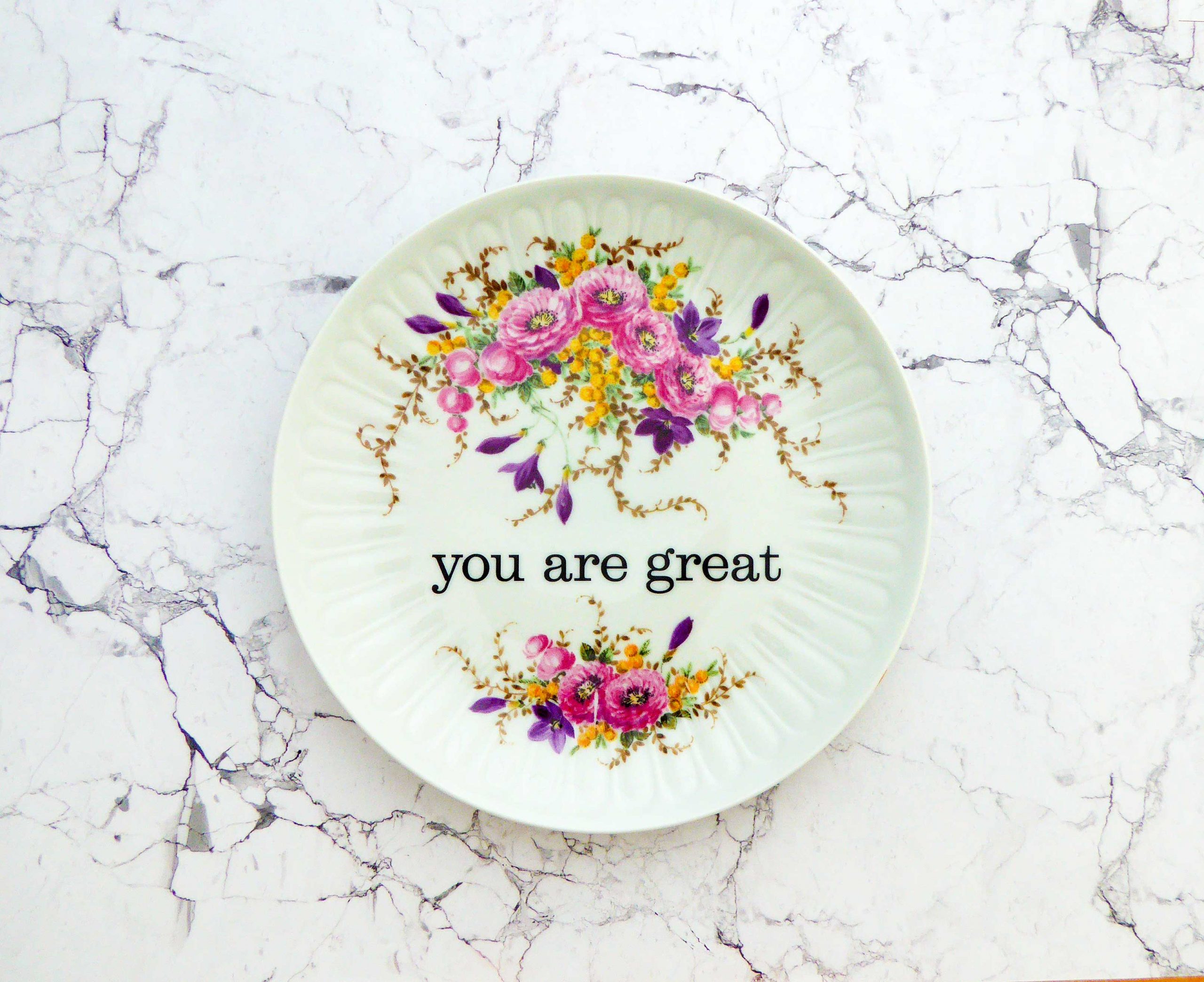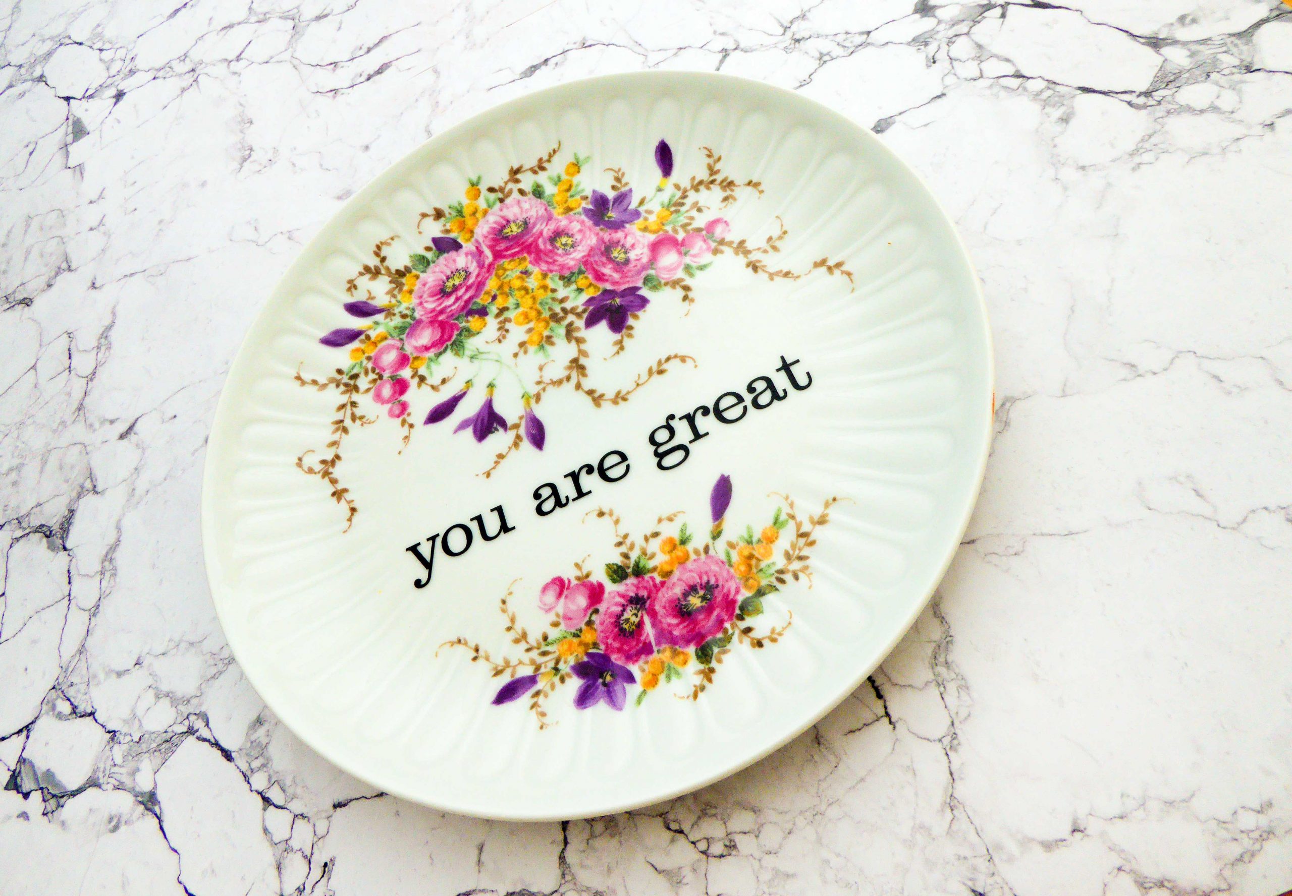 Jeder Wandteller wird handgefertigt und jeder der vintage Teller ist immer wieder ein Einzelstück. Diese besondere Wandteller hat ein schönes Blumen Decor mit in rosa/lila und mit unserer Typo you are great kann er für alle Dekozwecke genutz werden.