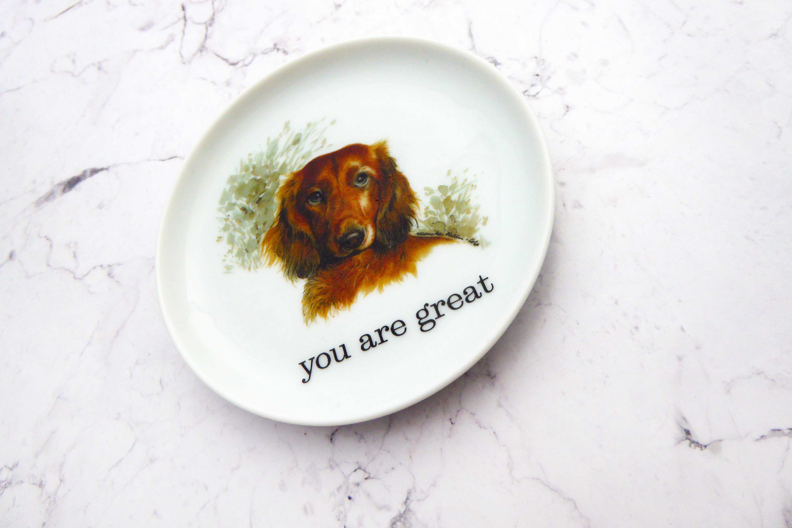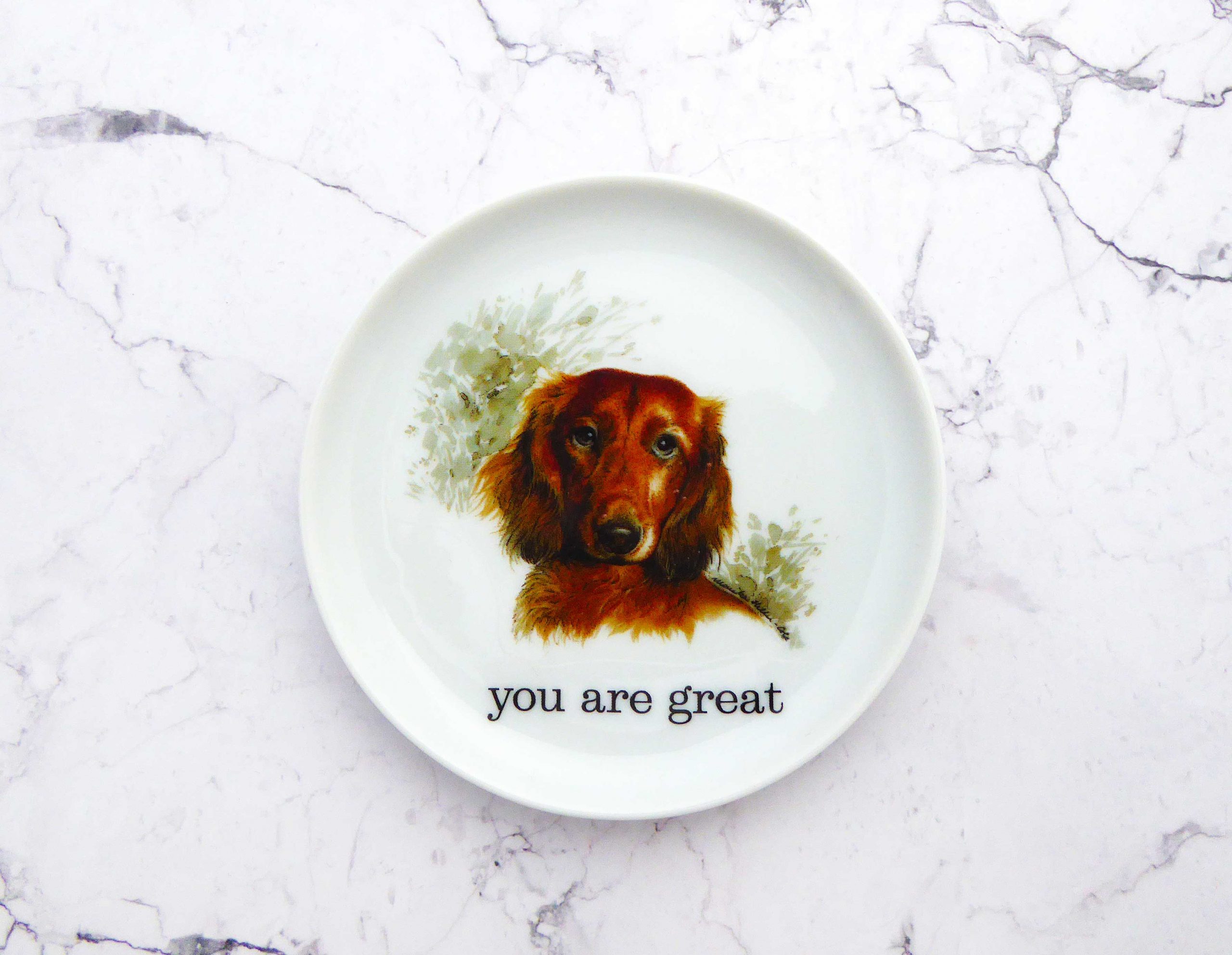 Jeder Wandteller wird handgefertigt und jeder der vintage Teller ist immer wieder ein Einzelstück. Diese besondere Wandteller hat ein schönes Dackel Decor und mit unserer Typo you are great kann er für alle Dekozwecke genutz werden.