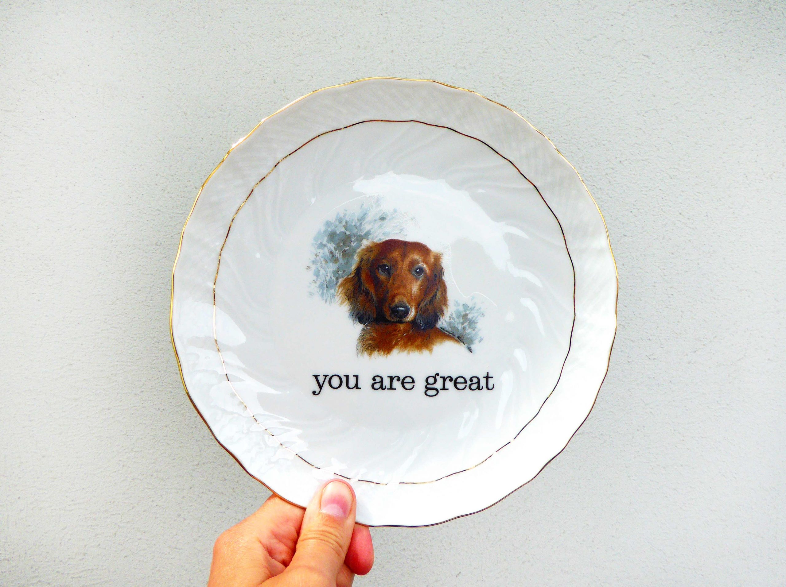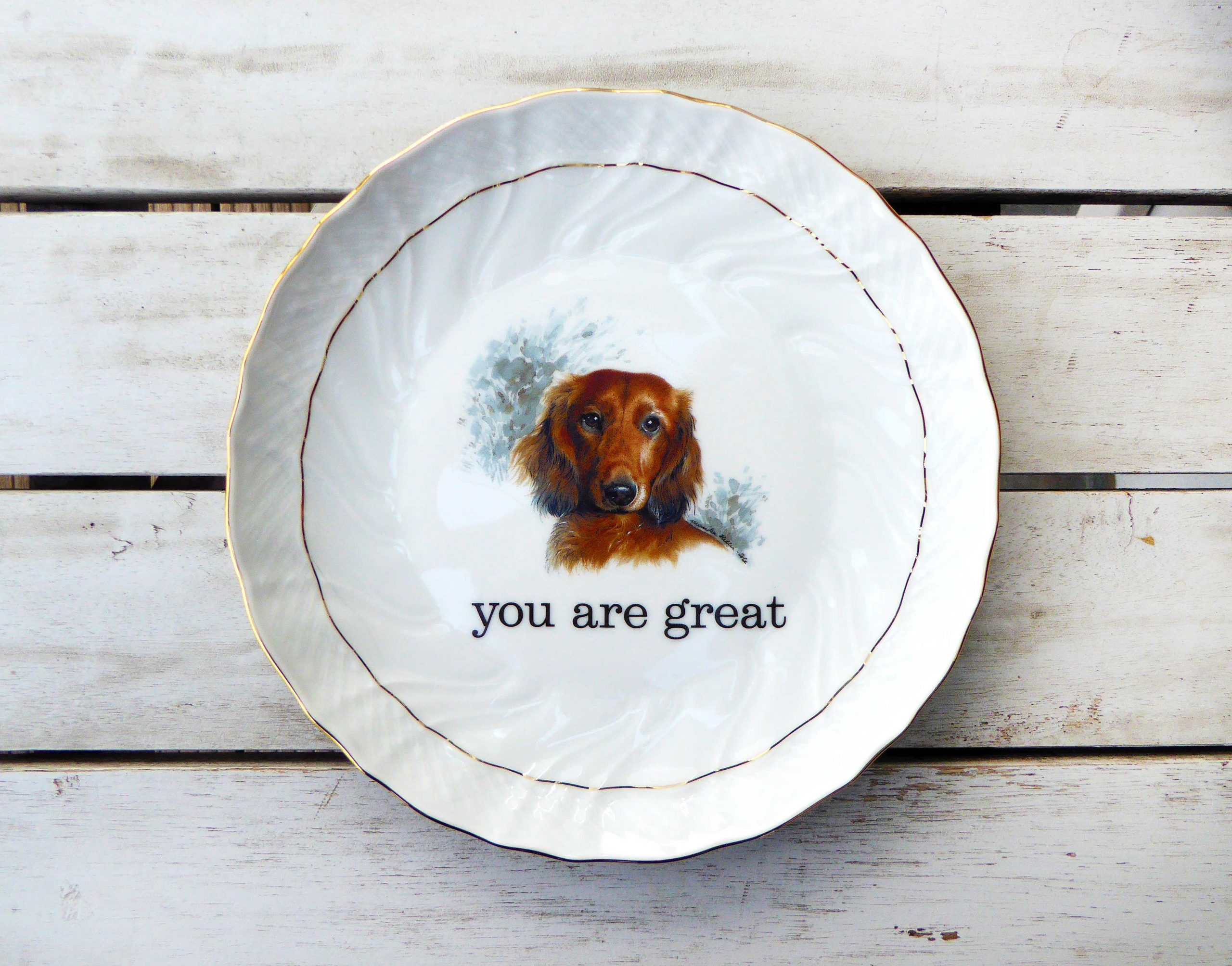 Jeder Wandteller wird handgefertigt und jeder der vintage Teller ist immer wieder ein Einzelstück. Diese besondere Wandteller hat ein schönes Dackel Decor mit Innengoldrand und mit unserer Typo you are great kann er für alle Dekozwecke genutz werden.