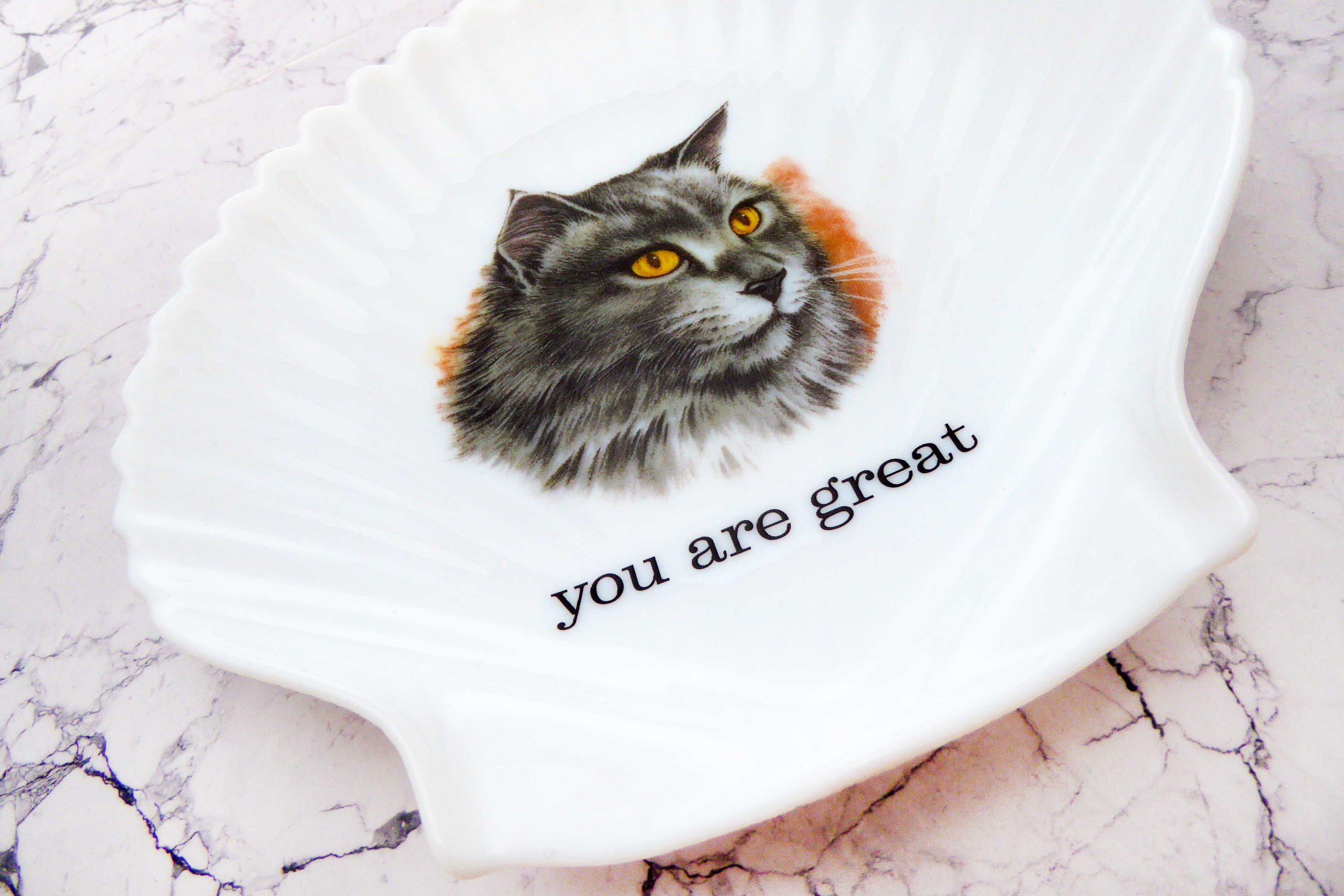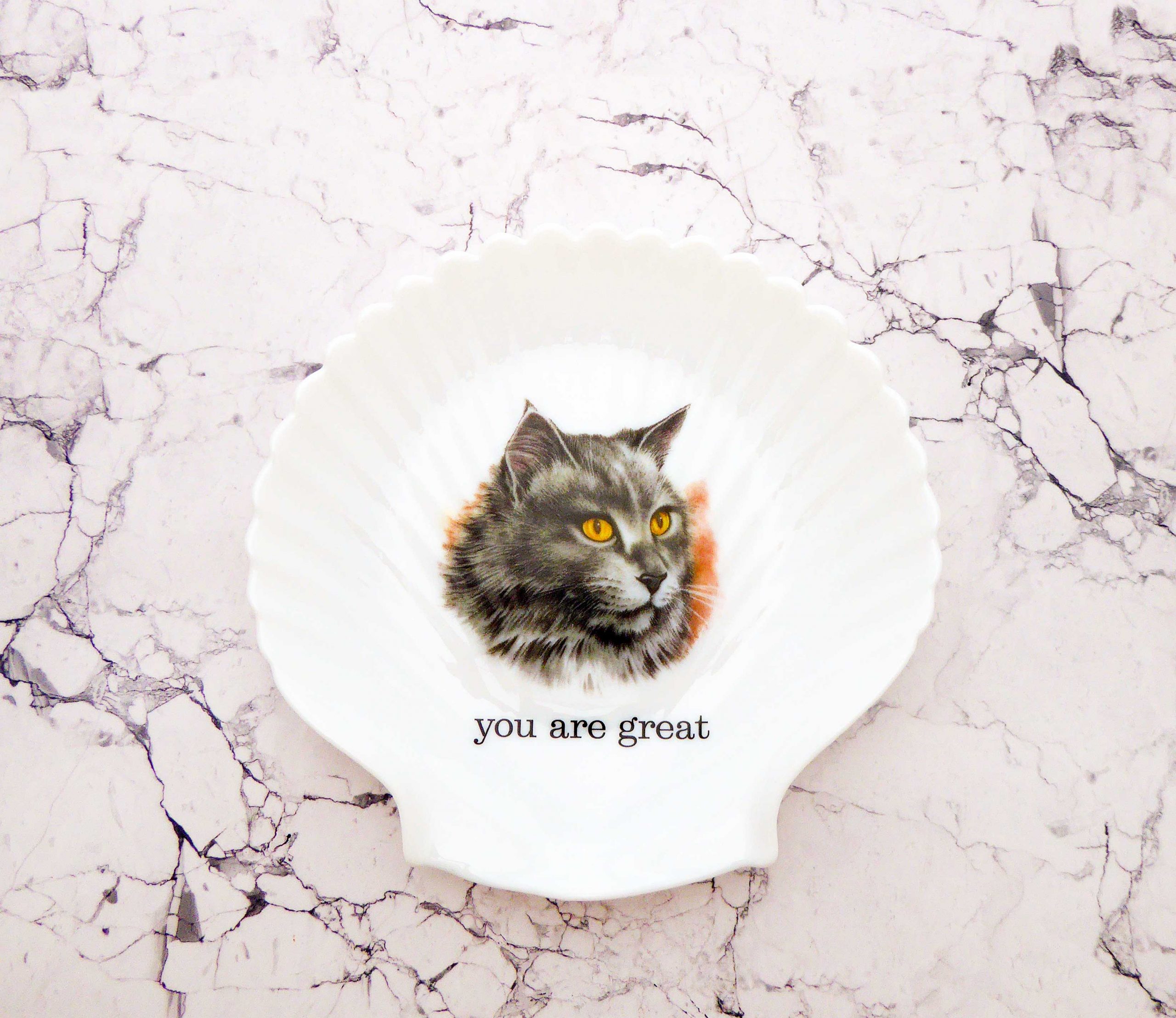 Jeder Wandteller wird handgefertigt und jeder der vintage Teller ist immer wieder ein Einzelstück. Dieser besondere Wandteller hat ein schönes Katze Decor mit einem schönen Wandteller in Muschelform und mit unserer Typo you are great kann er für alle Dekozwecke genutz werden.