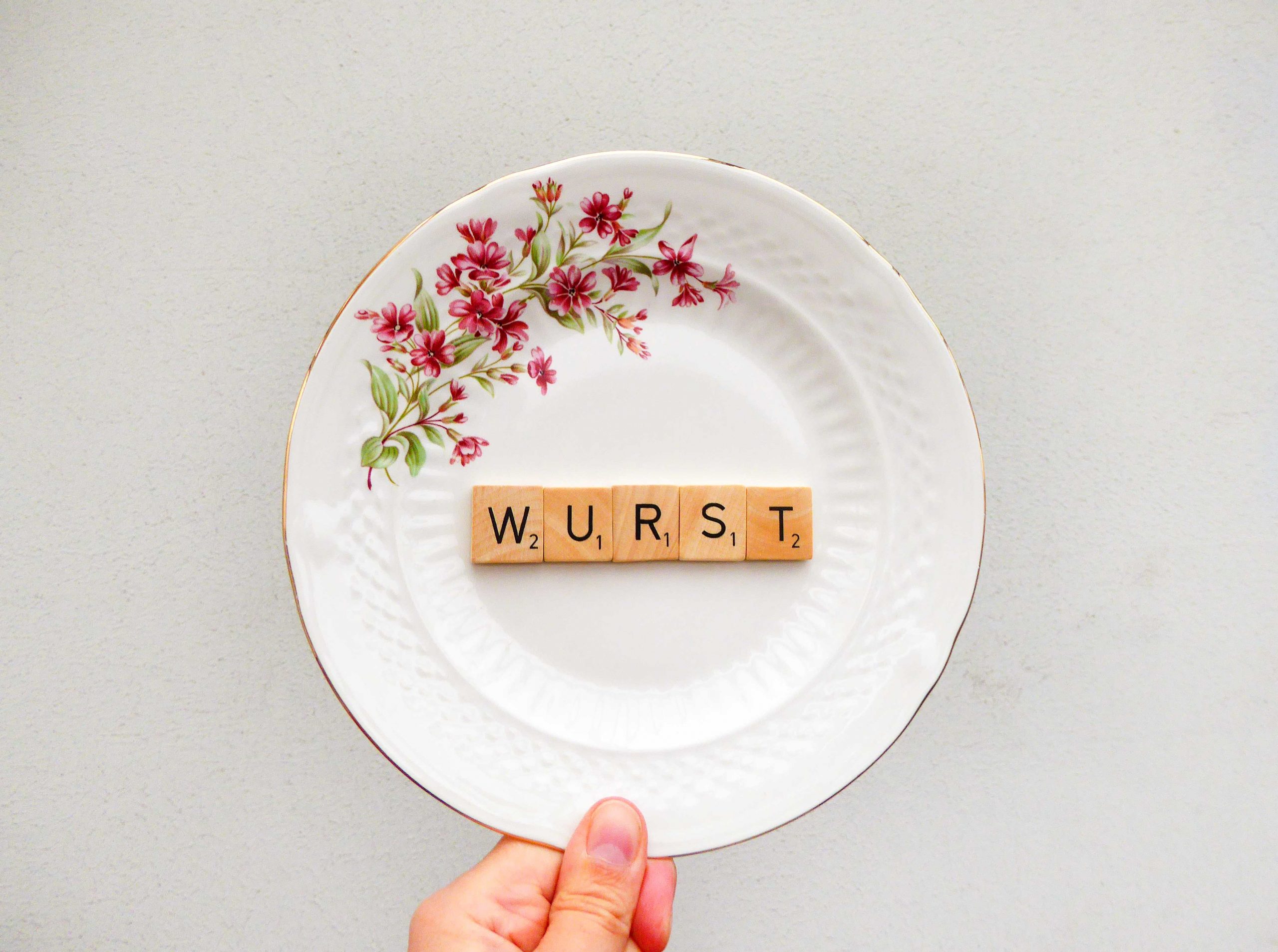 Dieser schöne Wandteller mit unserer Typo Wurst und einem besonderen burgund/rot Blumen Decor.