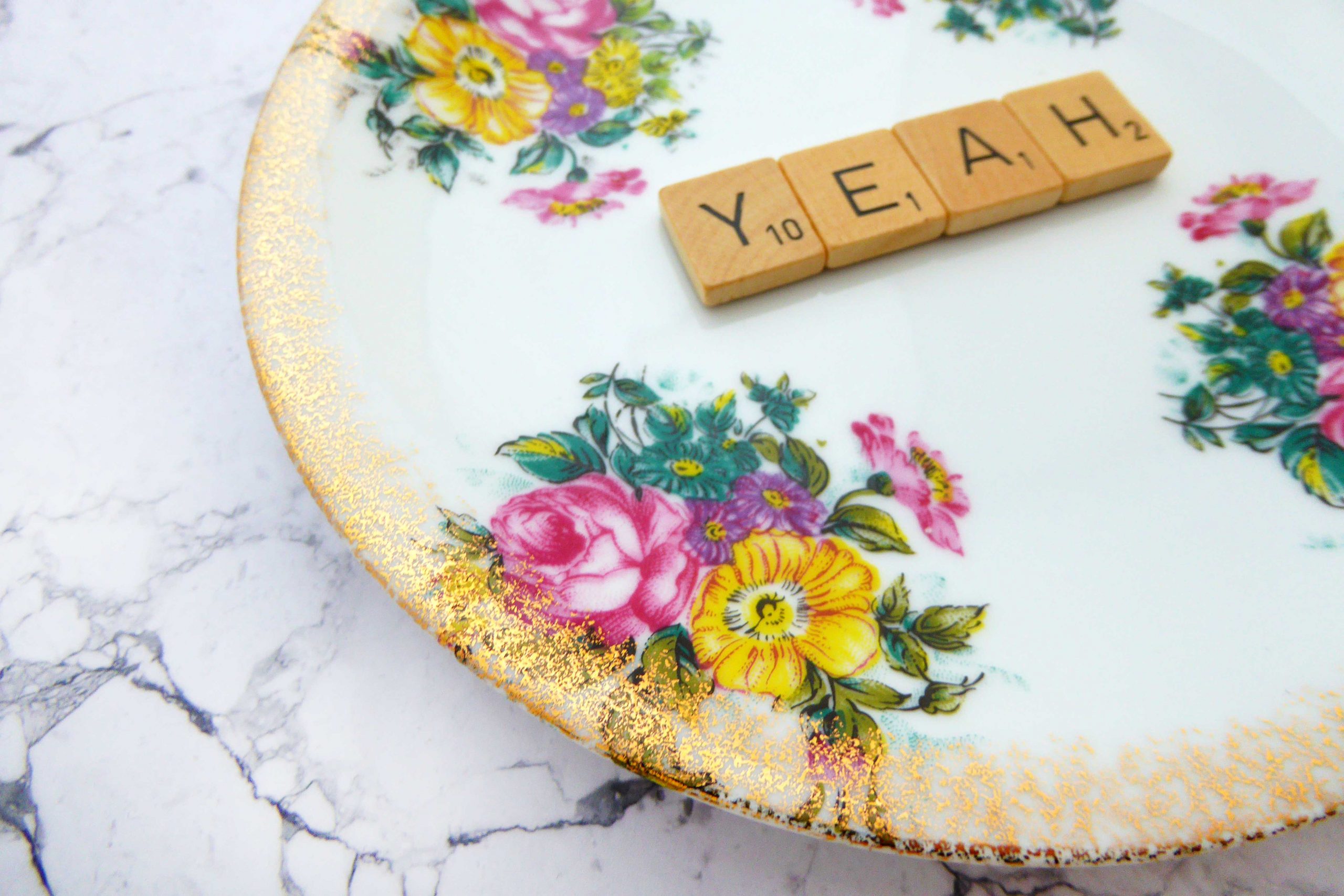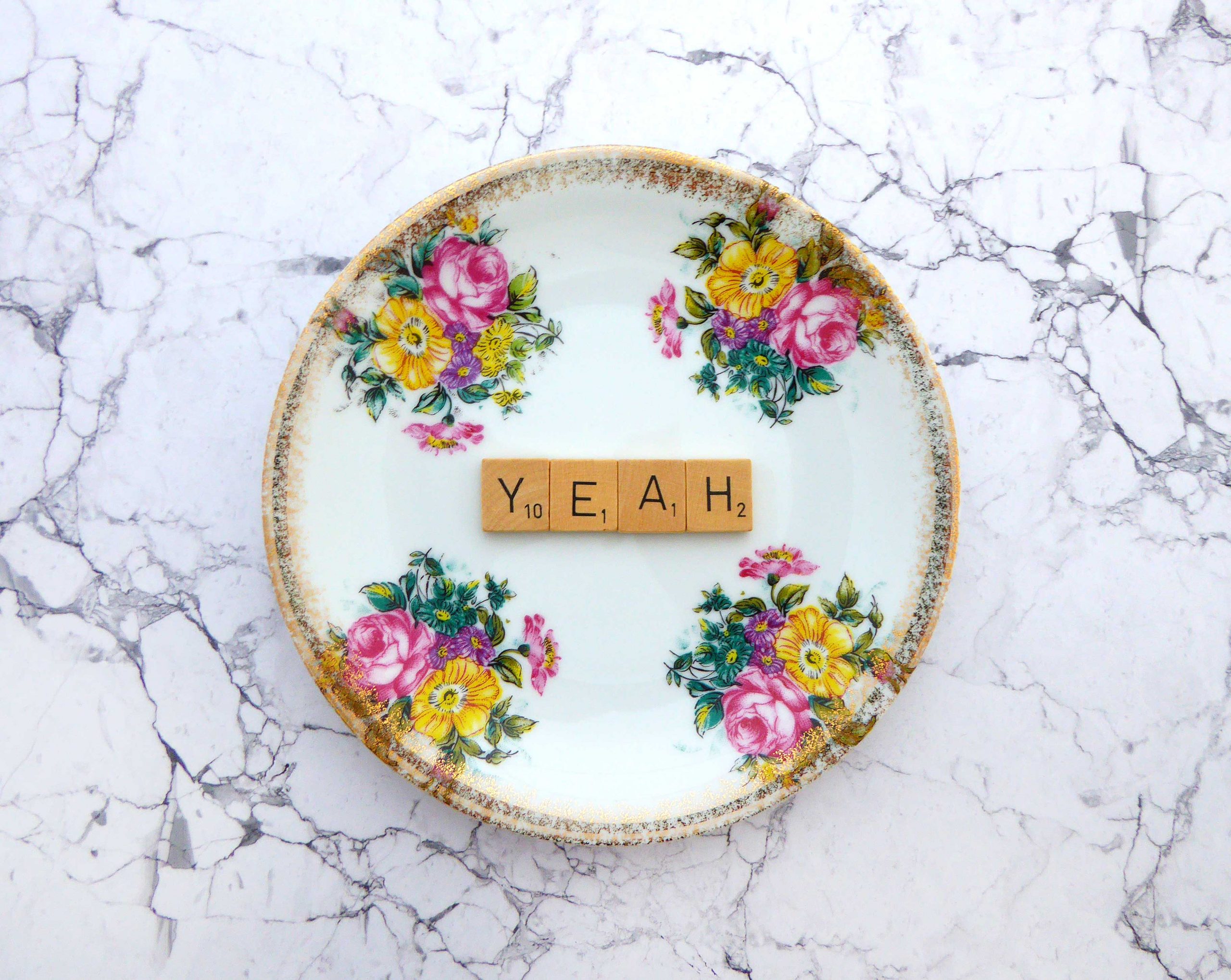 Jeder Wandteller ist ein Einzelstück. Dieser Wandteller hat einen wunderschönen Rand mit einem Bunten Blumen/Golddecor und unser Yeah Decor in Original Scrabble Steinen.
