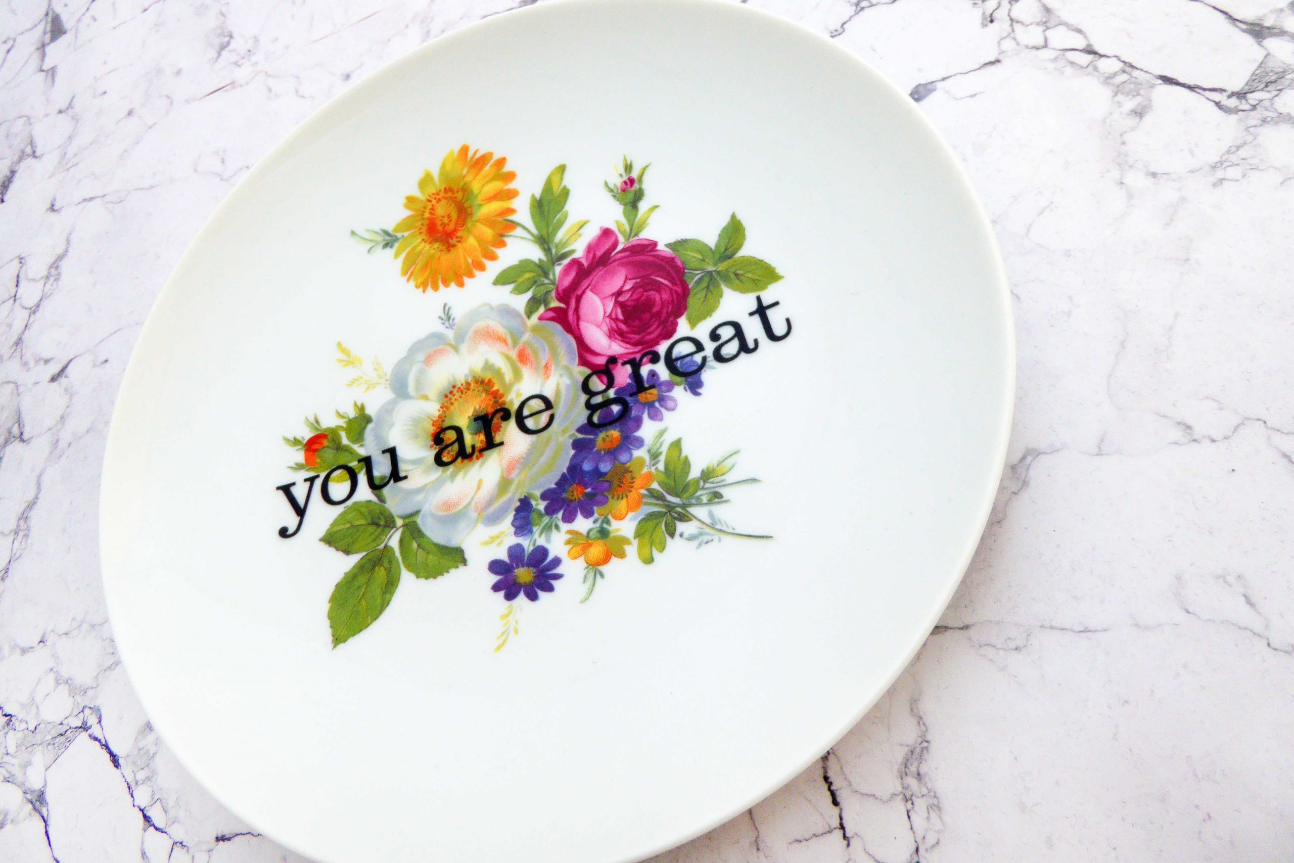 Jeder Wandteller wird handgefertigt und dieser vintage Teller ist ein Einzelstück. Dieser Wandteller hat ein schönes Blumenmuster, wunderbaren Goldrand und mit unserer you are great Typo kann er für alle Dekozwecke genutz werden.