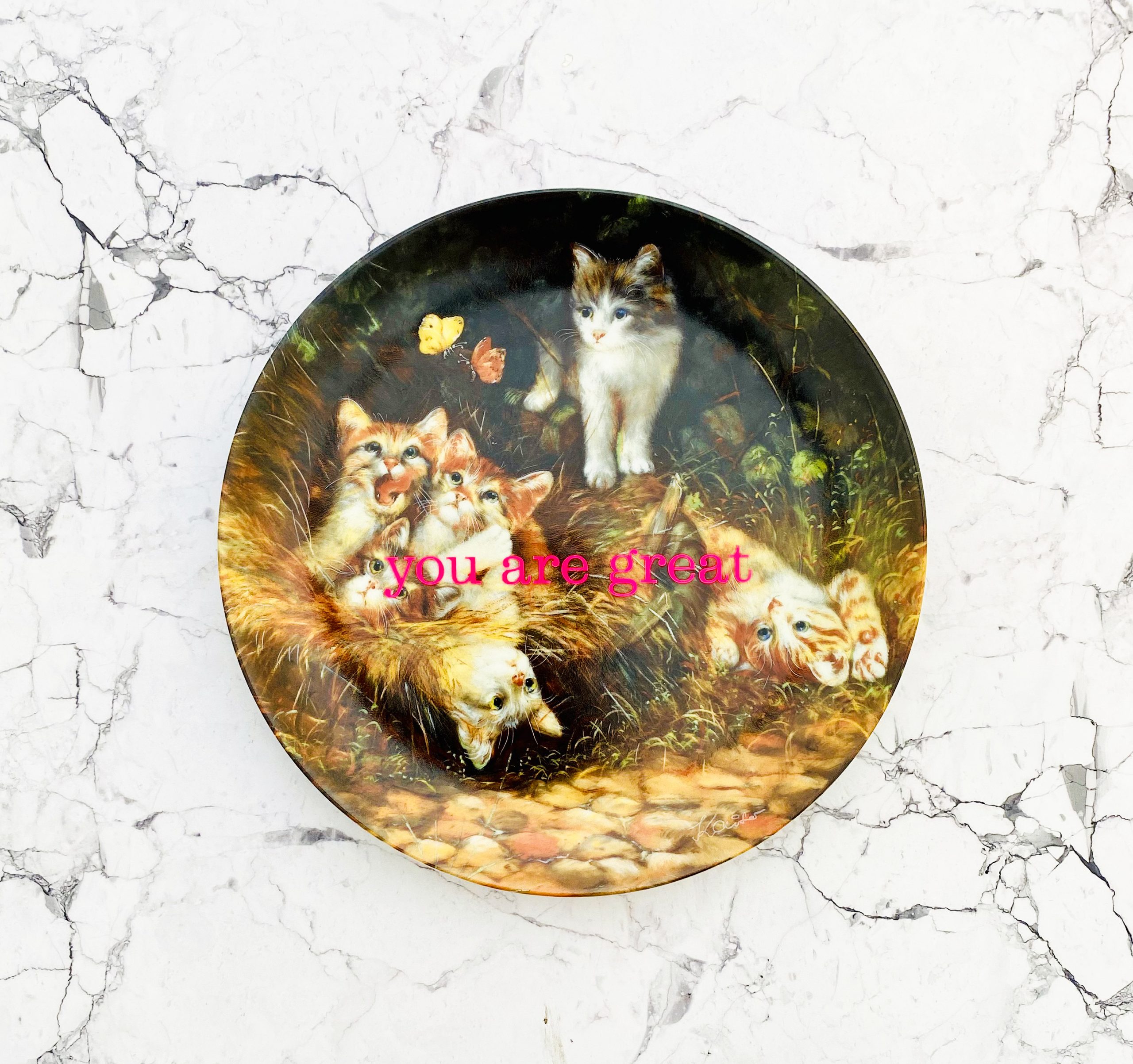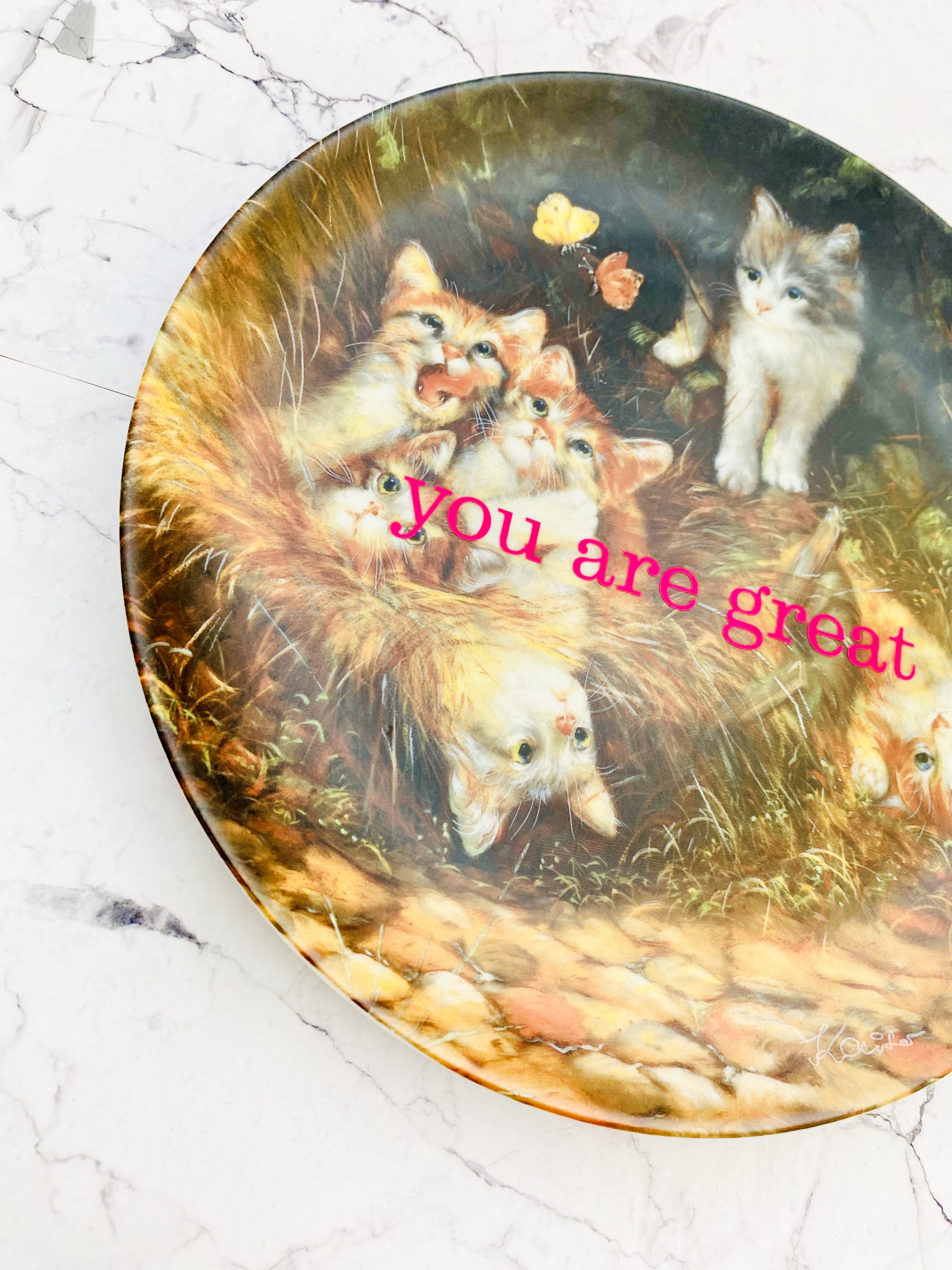 Jeder Wandteller wird handgefertigt und dieser vintage Teller ist ein Einzelstück. Dieser besondere Wandteller hat ein schönes Katzen Decor und mit unserer you are great Typo in neonpink ( super knallig, deutlich mehr als wir auf den Fotos abbilden können :)kann er für alle Dekozwecke genutz werden.