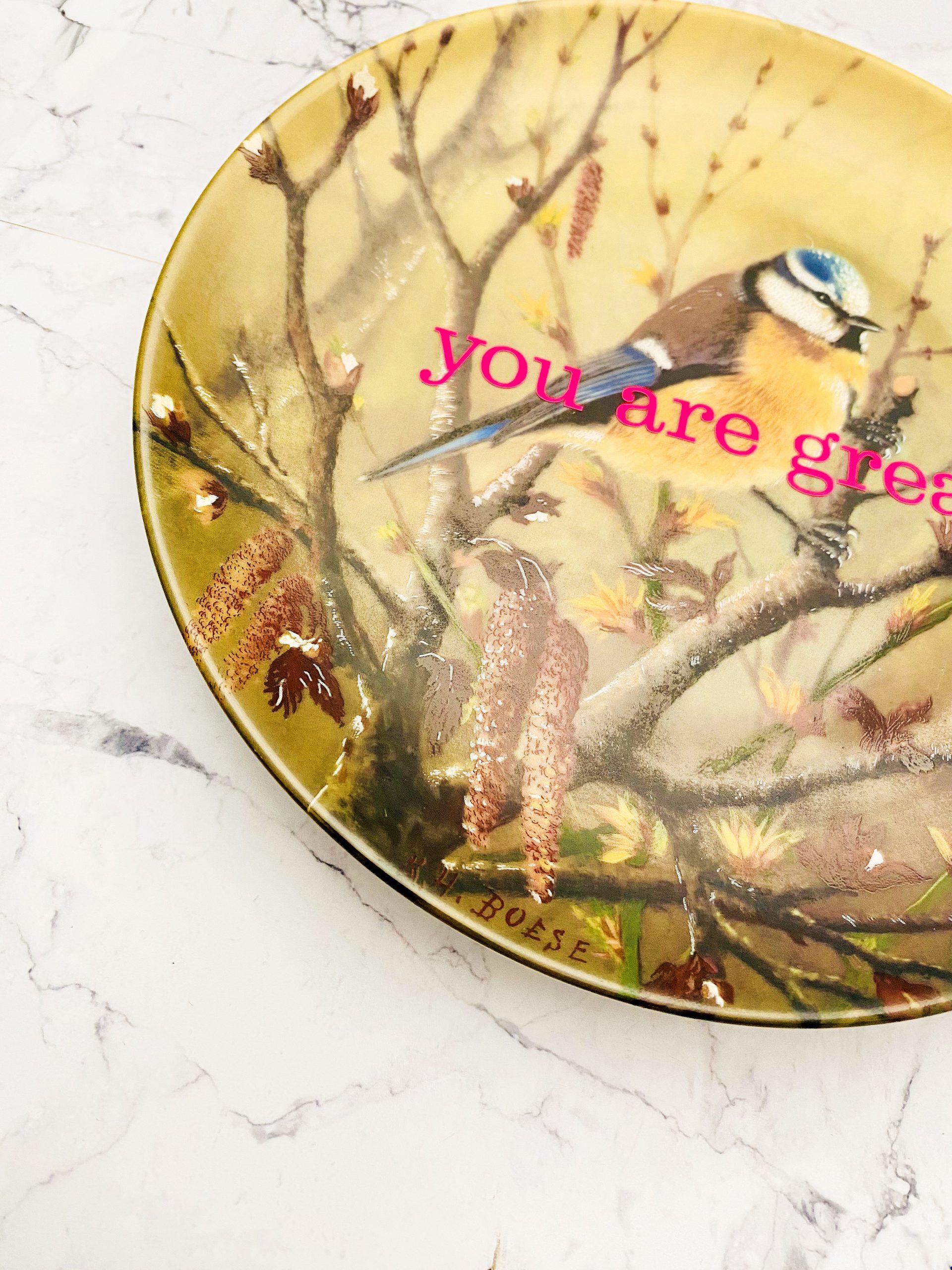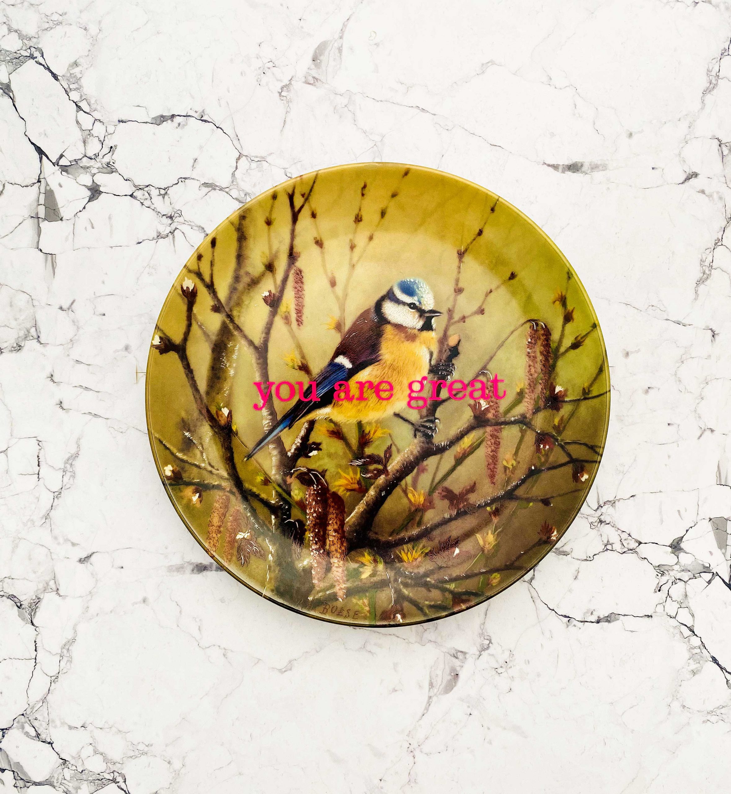 Jeder Wandteller wird handgefertigt und dieser vintage Teller ist ein Einzelstück. Dieser Wandteller hat ein schönes Blaumeise Decor und mit unserer you are great Typo in neonpink ( super knallig, deutlich mehr als wir auf den Fotos abbilden können :)kann er für alle Dekozwecke genutz werden.