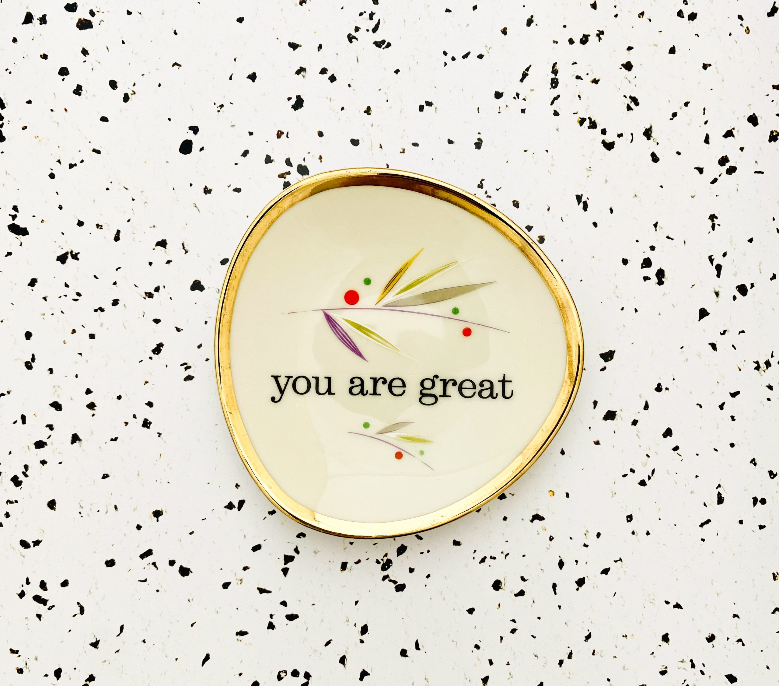 Jeder Wandteller wird handgefertigt und jeder der vintage Teller ist immer wieder ein Einzelstück. Diese kleine eckige Wandteller hat ein schönes Grafikmuster, einen Goldrand und mit unserem Typo you are great kann er für alle Dekozwecke genutz werden.
