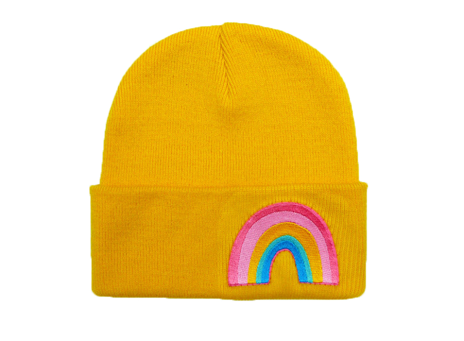 Herr Fuchs Mütze mit wunderschönem großen Regenbogen. Schöne Mütze mit Regenbogenapplikation/Patch. Die Mütze ist gelb und ist waschbar bis 30°.