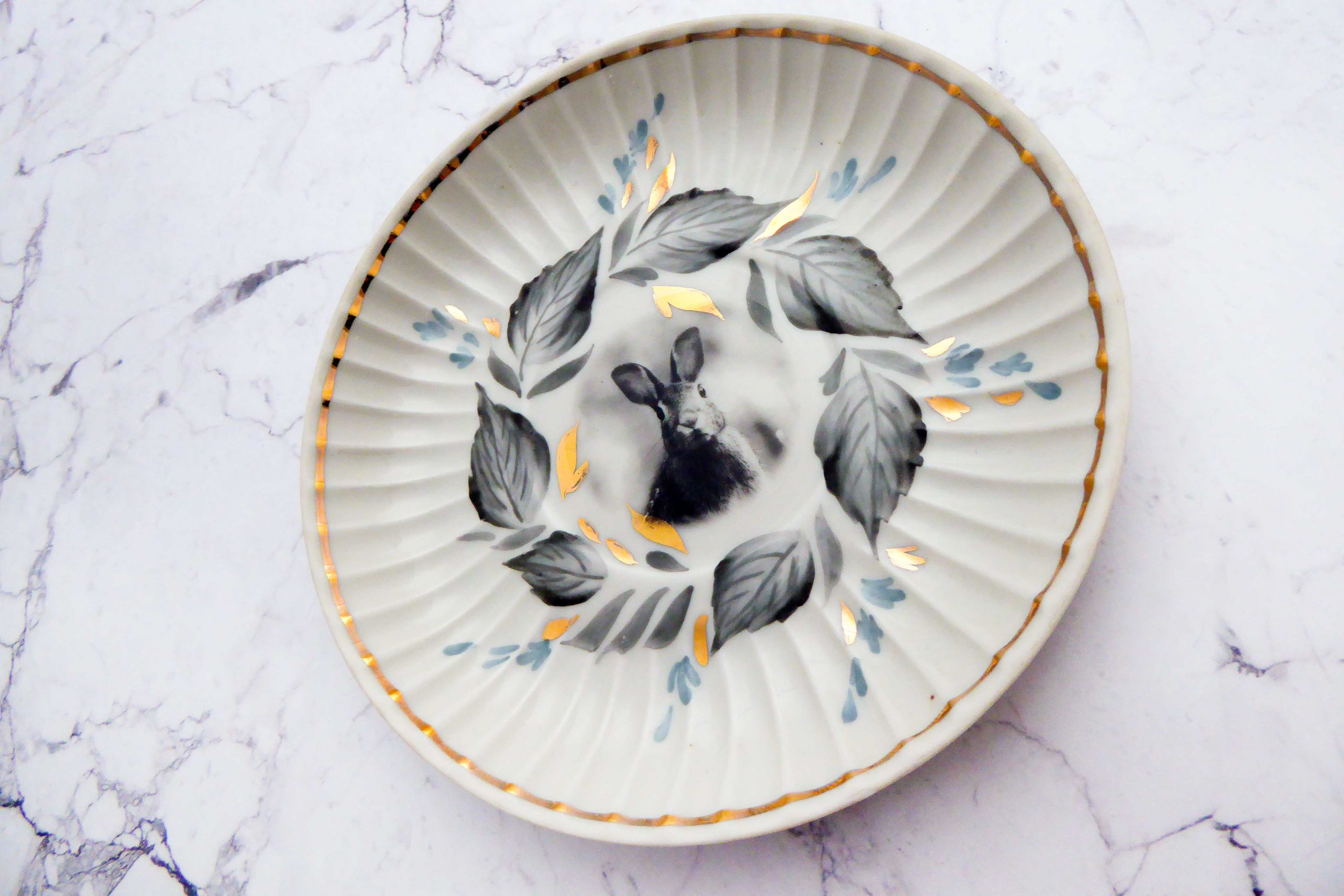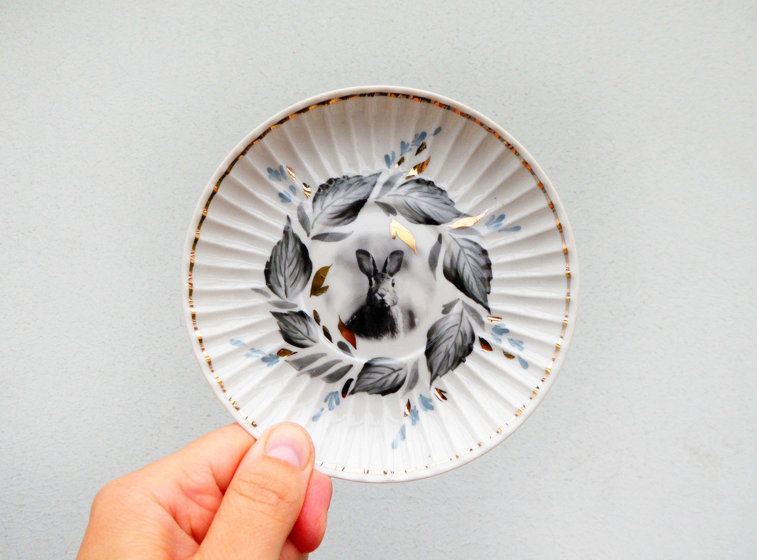 Jeder Wandteller wird handgefertigt und jeder der vintage Teller ist immer wieder ein Einzelstück. Dieser besondere Wandteller hat einen schönen golden Rand mit Muster und mit unserem Hase kann er für alle Dekozwecke genutz werden.
