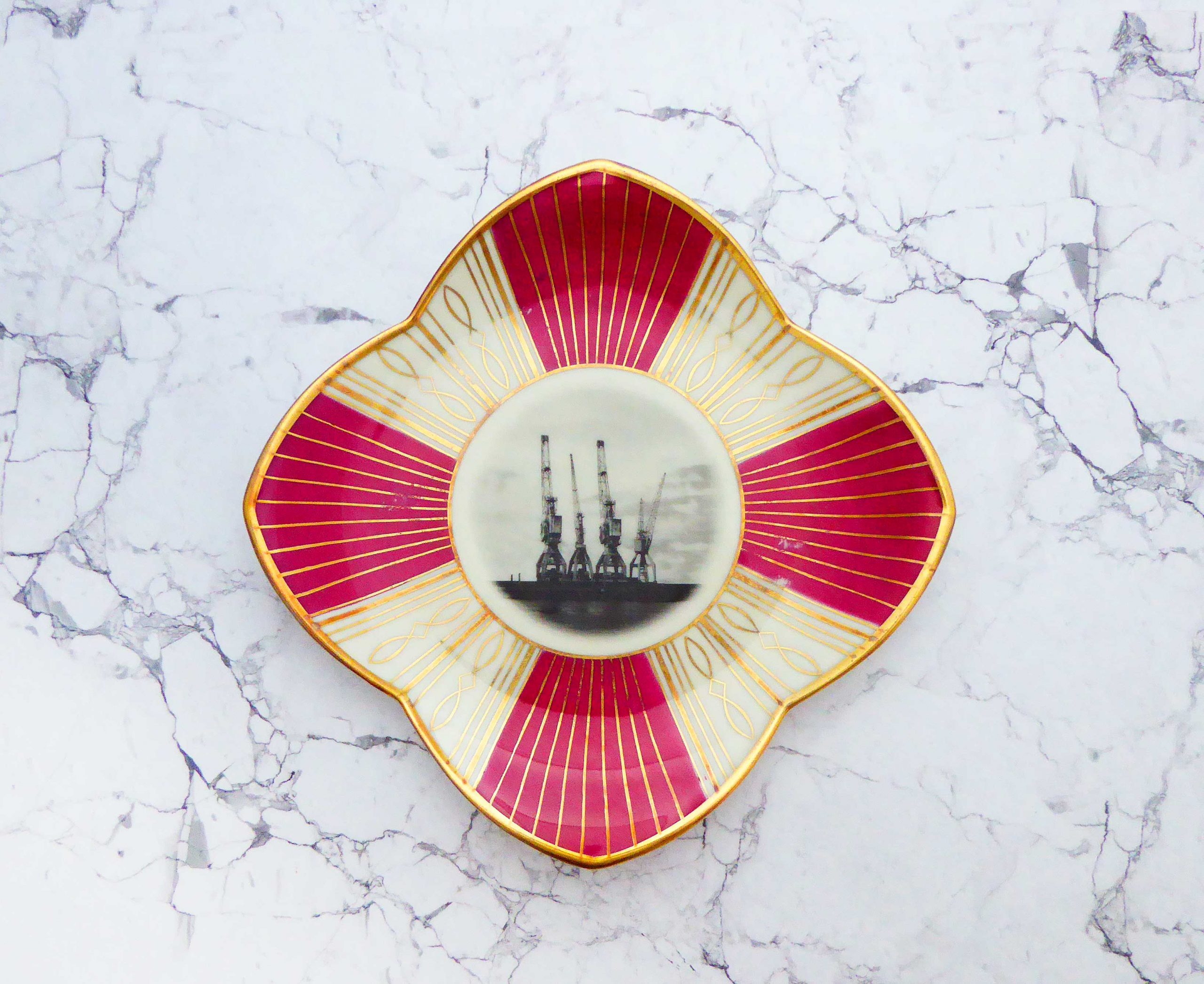 Unser vintage Wandteller mit unseren Hamburger Hafen Kränen ist ein besonderes Stück für Deine Wand.