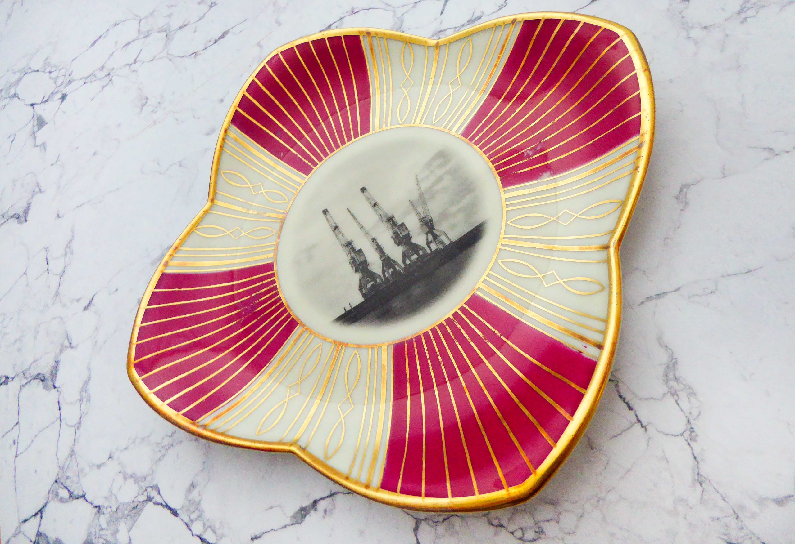 Dieser schöne Wandteller hat einen schöne eckige Form, ein wunderschönes Decor in rot/gold und mit unseren Hamburger Hafen Kränen kann er für alle Dekozwecke genutz werden.