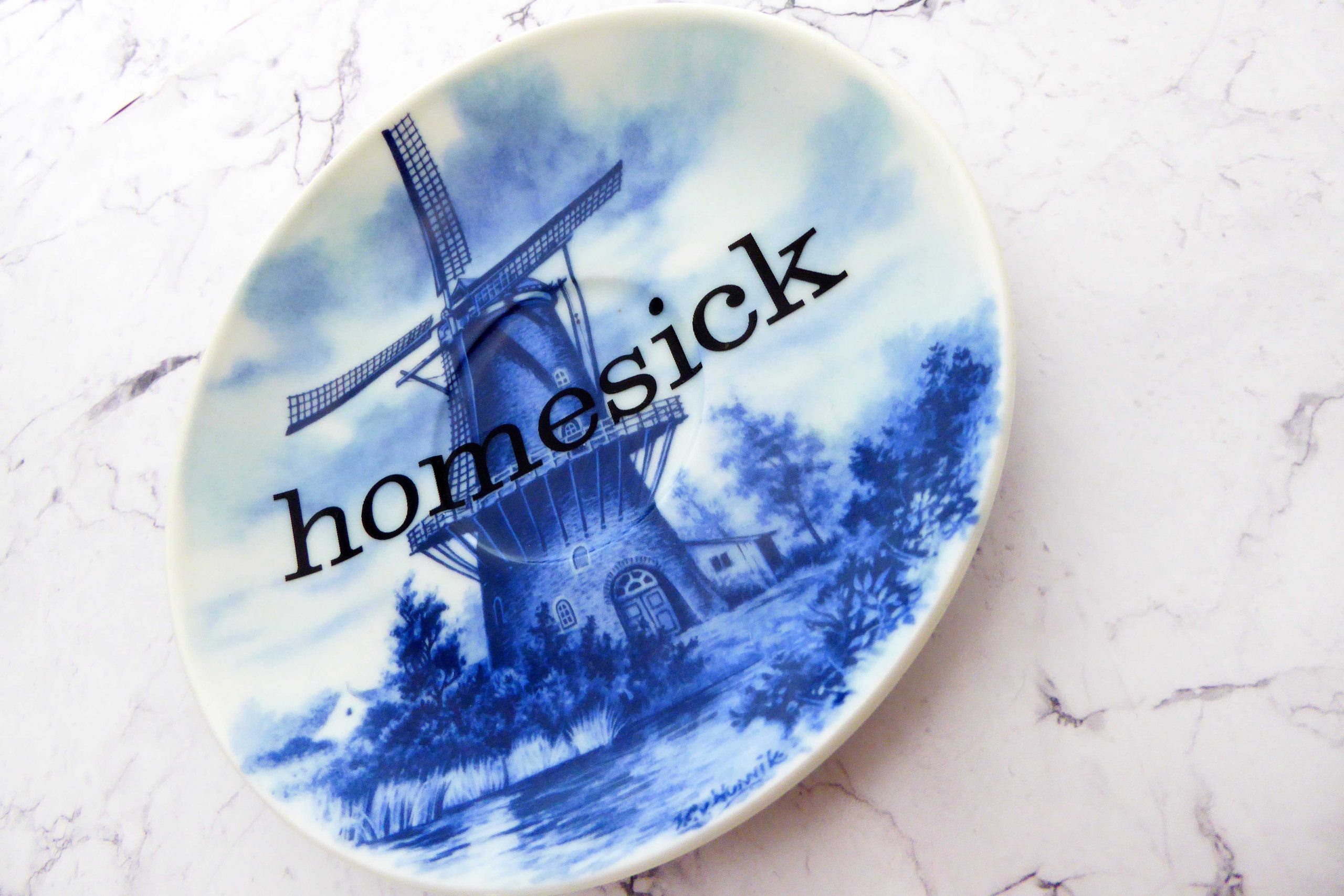 Jeder Wandteller wird handgefertigt und jeder der vintage Teller ist immer wieder ein Einzelstück. Diese Wandteller hat einen schönen Blaue Delfter Mühle Decor und mit unserem Typo homesick kann er für alle Dekozwecke genutz werden.