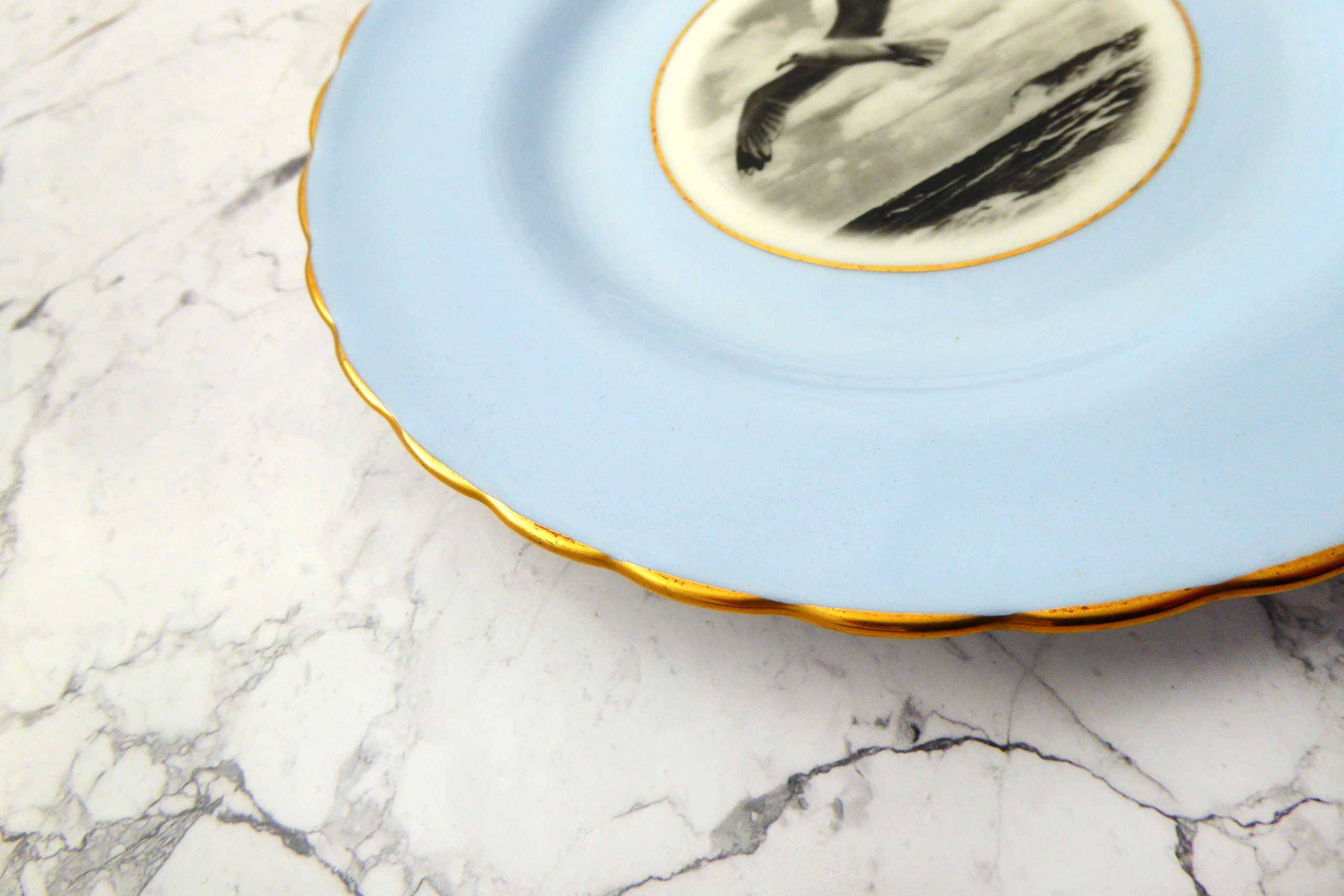 Jeder Wandteller wird handgefertigt und jeder der vintage Teller ist immer wieder ein Einzelstück. Diese besondere Wandteller hat einen schönen breiten blauen Rand mit besonderem goldenen Wellenrand. Mit unserer Möwe kann er für alle Dekozwecke genutz werden.