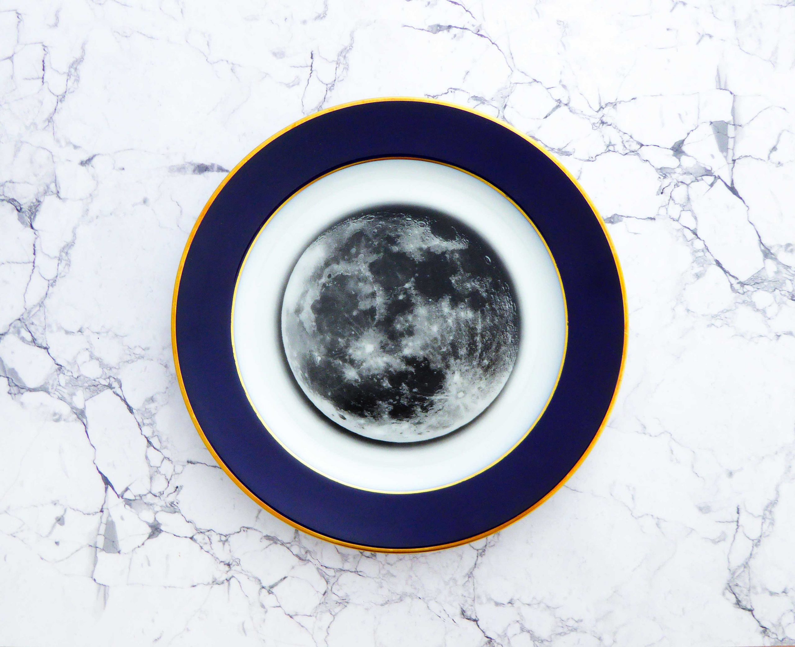 Jeder Wandteller wird handgefertigt und jeder der vintage Teller ist immer wieder ein Einzelstück. Diese schöne Wandteller hat einen schönen inneren dunkelblauen Rand und einen besonderen Innen Goldrand . Mit unserem Mond kann er für alle Dekozwecke genutz werden.
