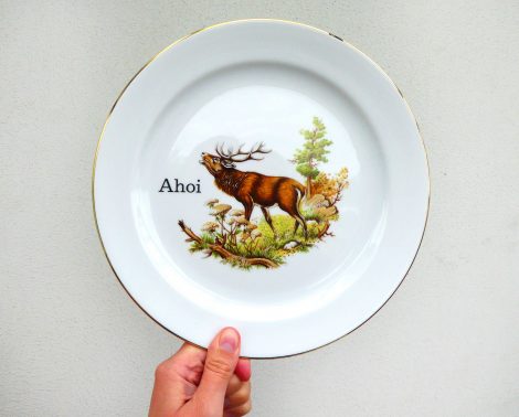 Jeder Wandteller wird handgefertigt. Diese Wandplatte hat einen goldenen Rand und einem besonderen Hirsch Decor und mit unserer Typo Ahoi kann er für alle Dekozwecke genutz werden.