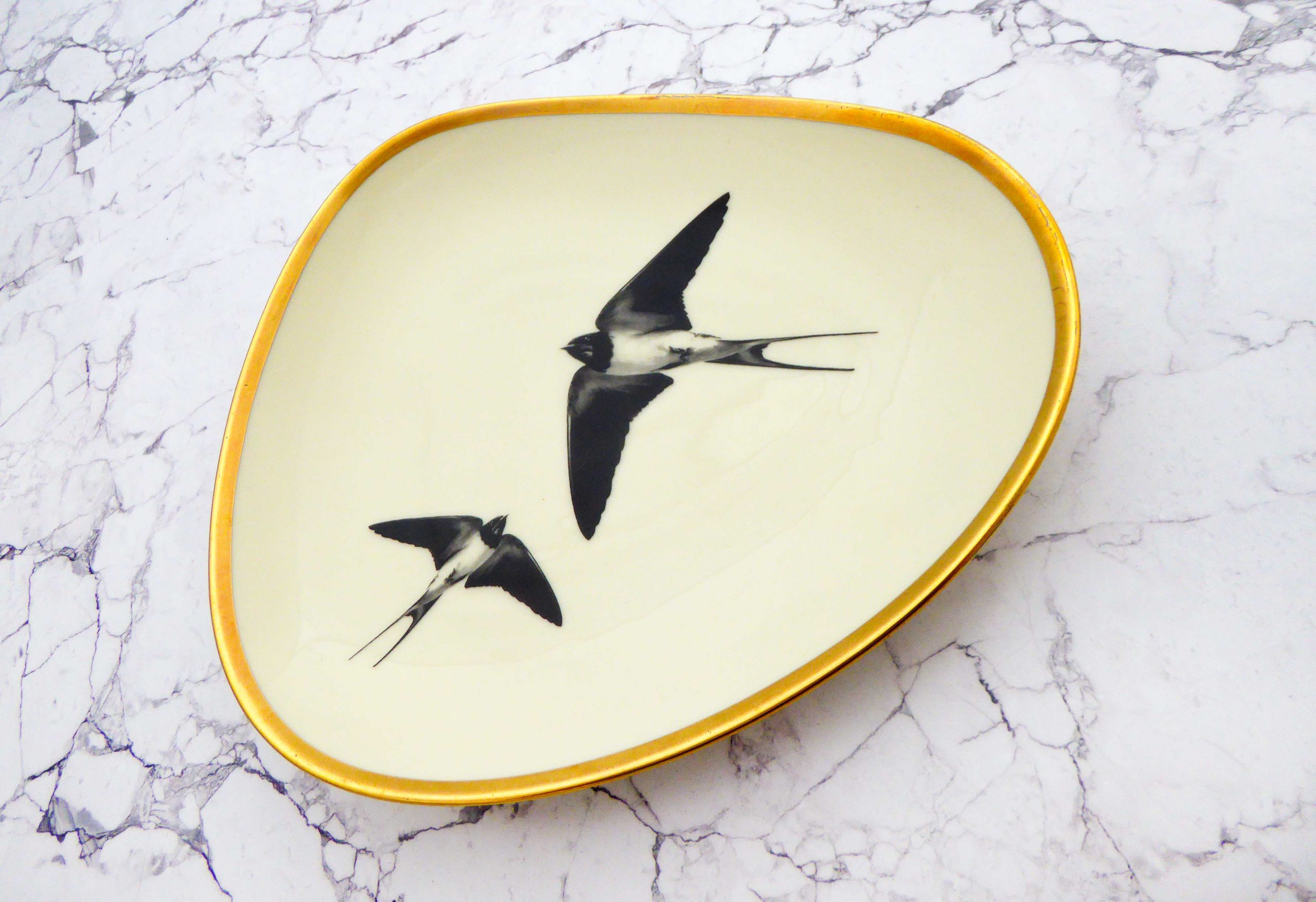Dieser schöne Wandteller ist eckig und hat einen Goldrand und mit unseren Schwalben kann er für alle Dekozwecke genutz werden.