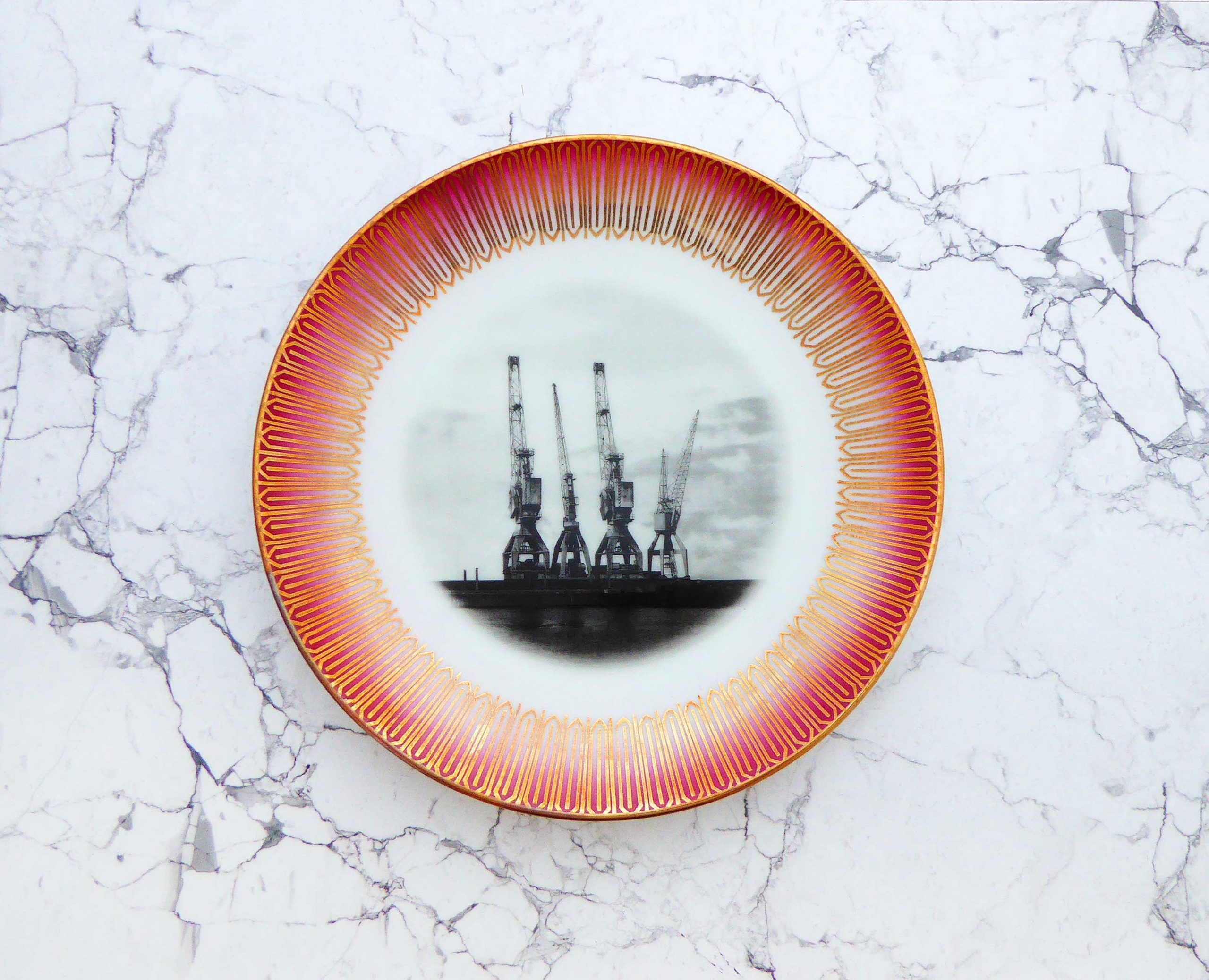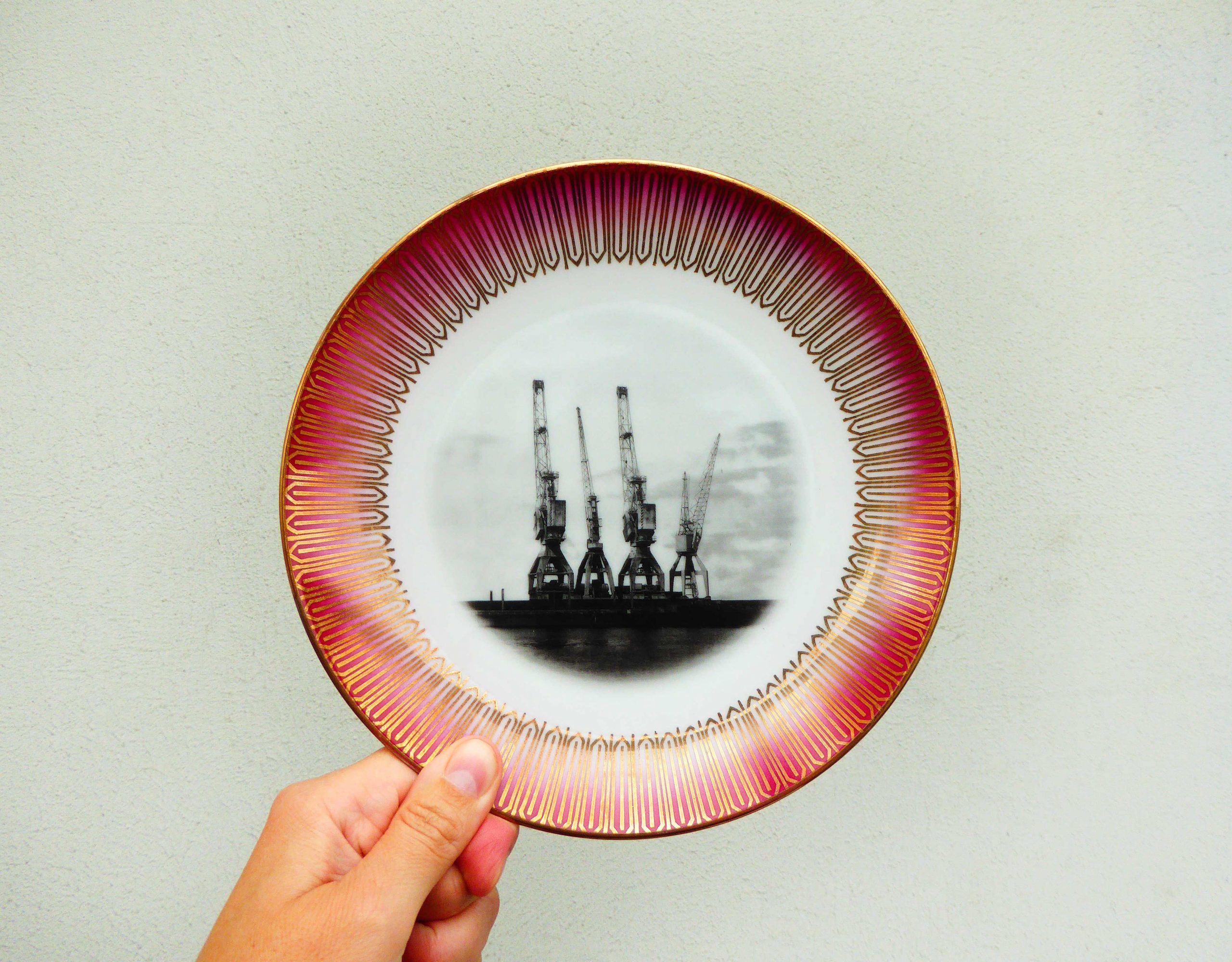 Unser Vintage Wandteller mit unseren Hamburger Hafen Kränen ist ein besonderes Stück für Dein Zuhause.
