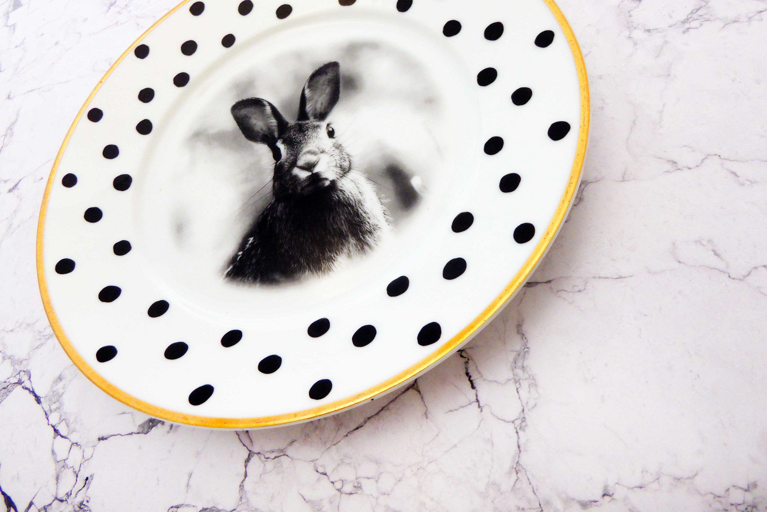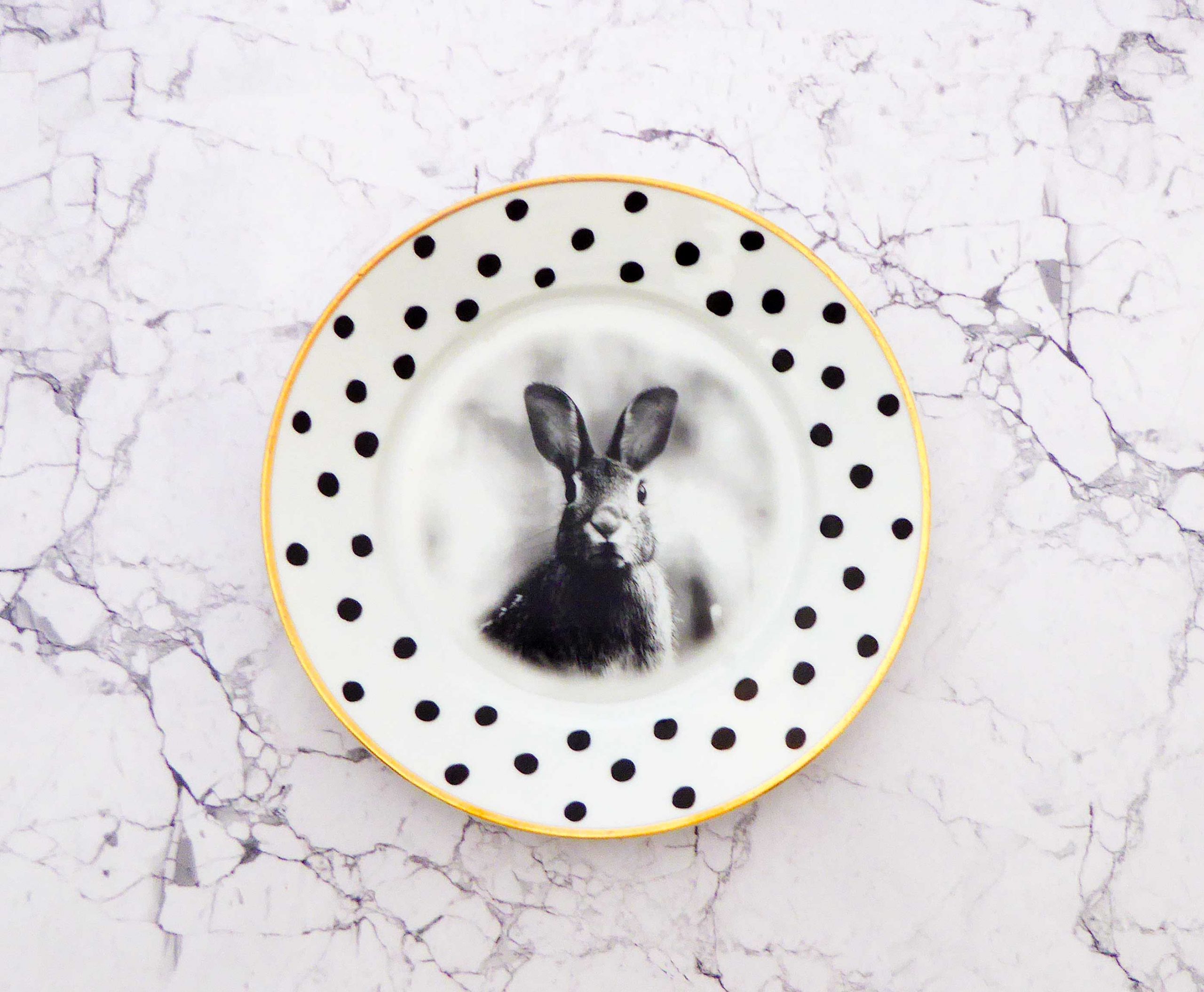 Jeder Wandteller wird handgefertigt und jeder der vintage Teller ist immer wieder ein Einzelstück. Dieser Wandteller hat einen schönen Goldrand, super Decor mit Punkten in schwarz und mit unserem Hase kann er für alle Dekozwecke genutz werden.