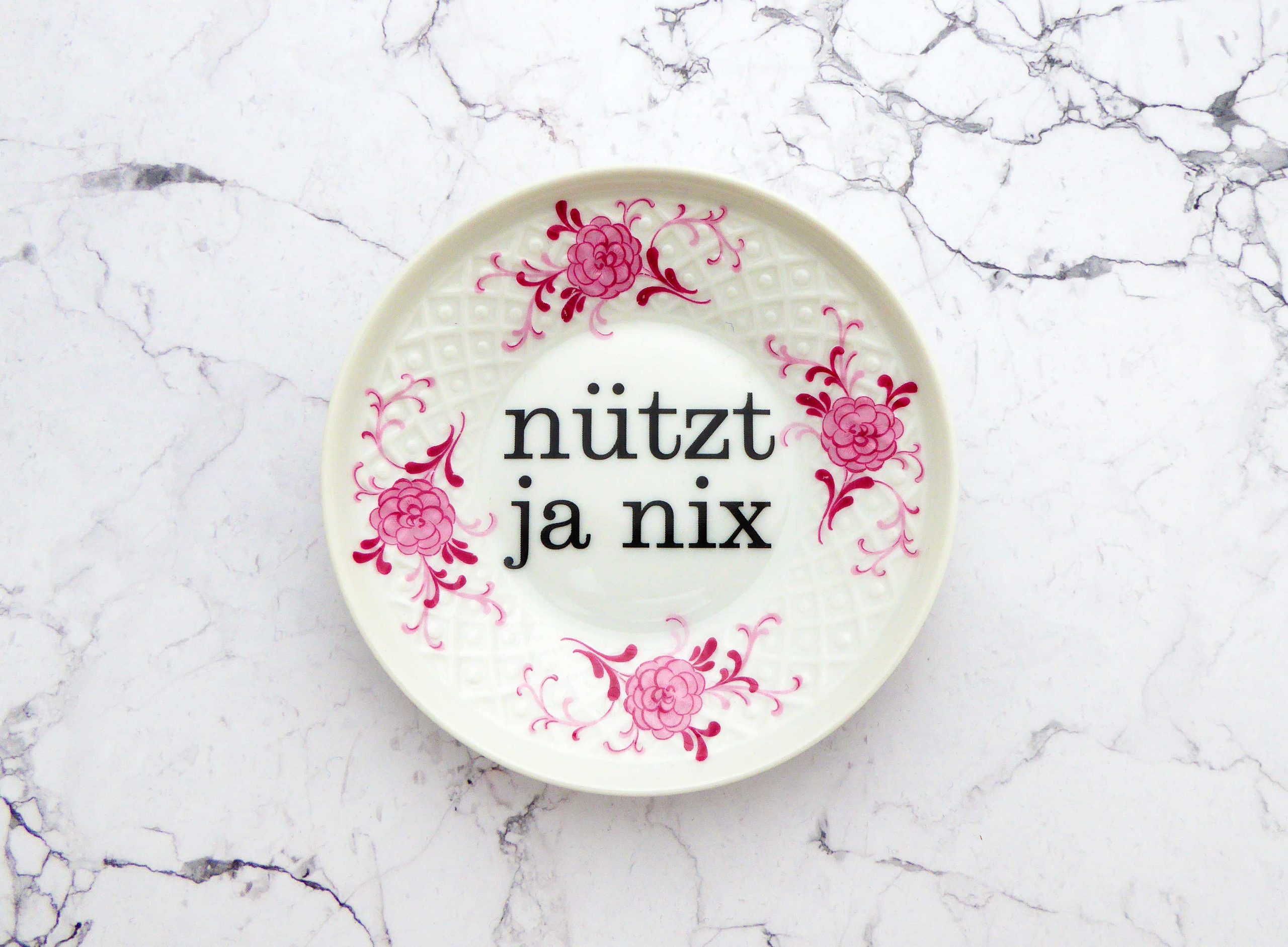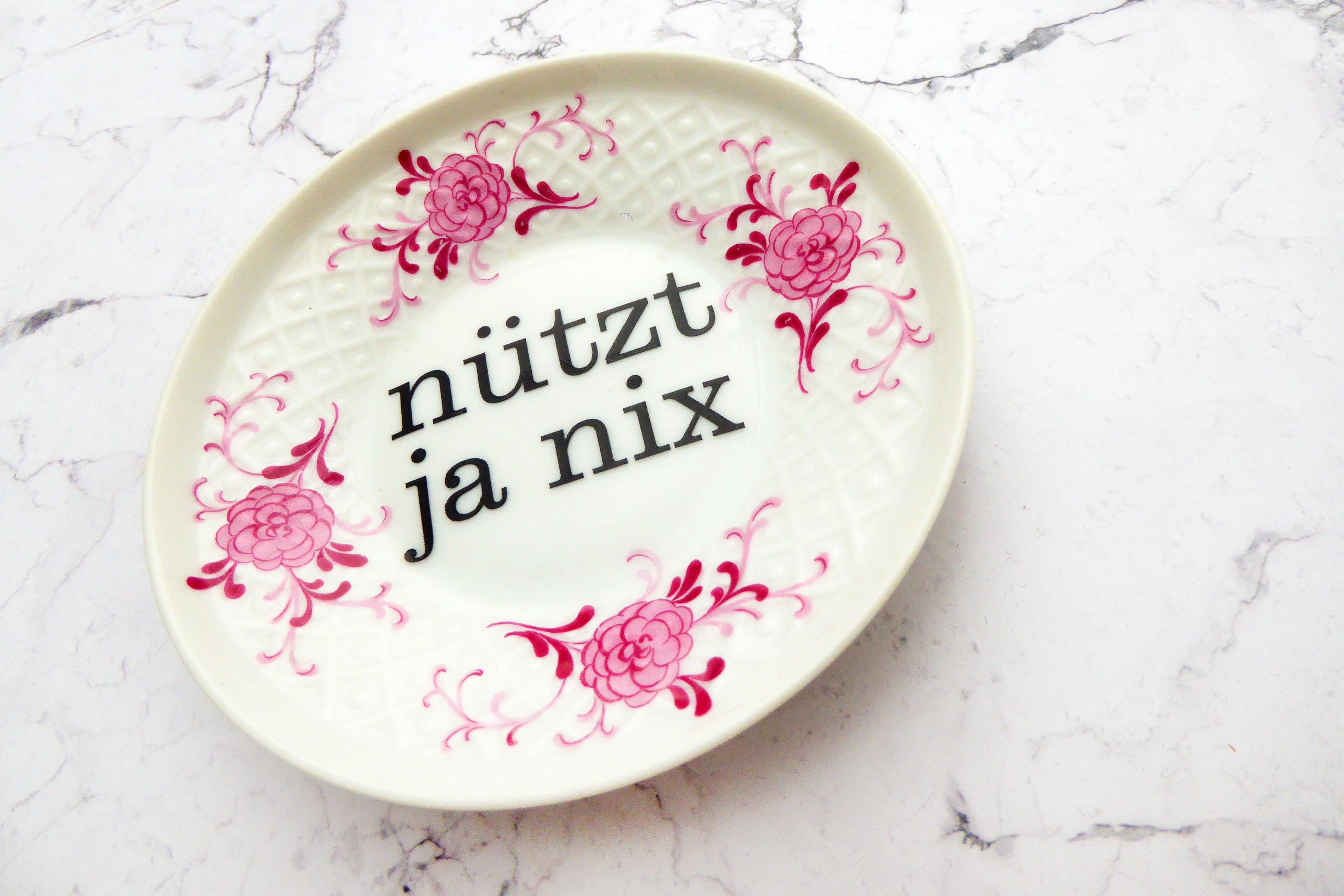 Unser vintage Wandteller mit unser nützt ja nix Typo ist ein besonderes Stück für Dein Zuhause.