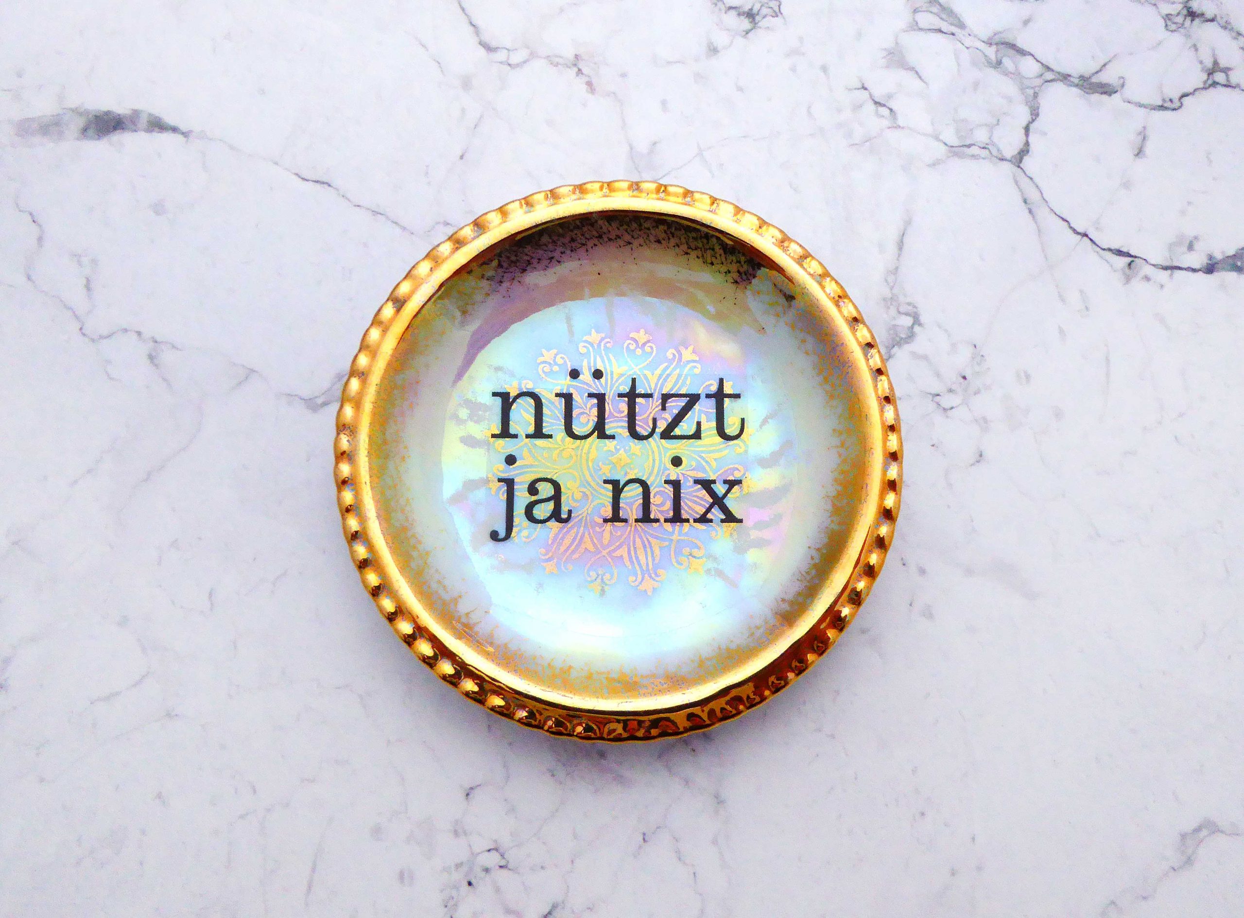 Jeder Wandteller wird handgefertigt und jeder der vintage Teller ist immer wieder ein Einzelstück. Dieser mini Wandteller hat einen besonders schönen Goldrand, ein Gold Muster in der Mitte , schillert in allen Regenbogenfarben und mit unser Typo nützt ja nix kann er für alle Dekozwecke genutz werden.