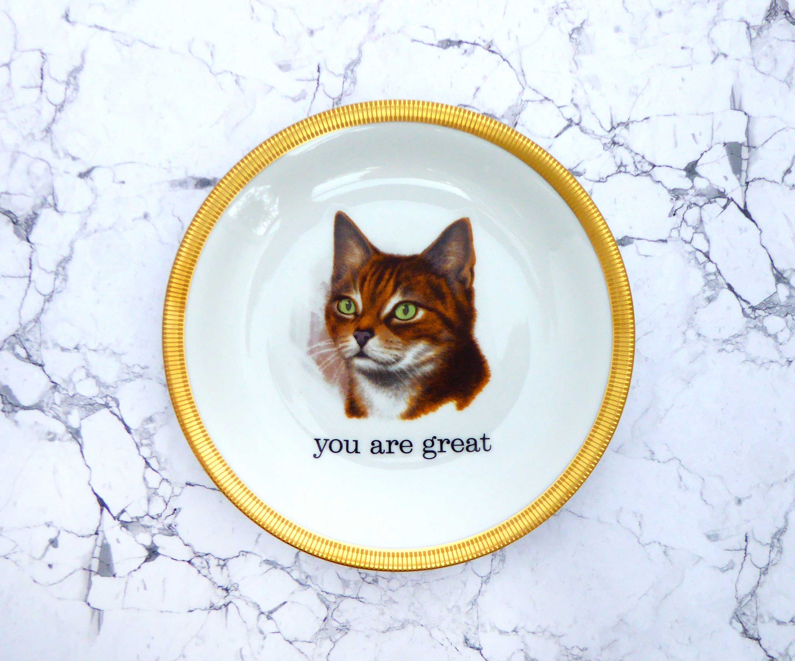 Jeder Wandteller wird handgefertigt und jeder der vintage Teller ist immer wieder ein Einzelstück. Dieser besondere Wandteller hat ein schönes Katze Decor mit einem schönen Goldrand und mit unserer Typo you are great kann er für alle Dekozwecke genutz werden.