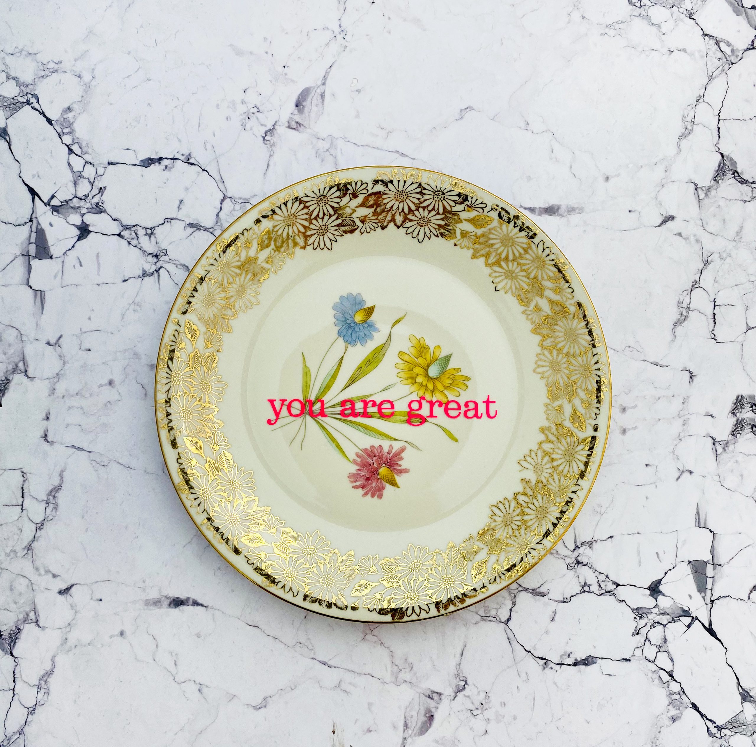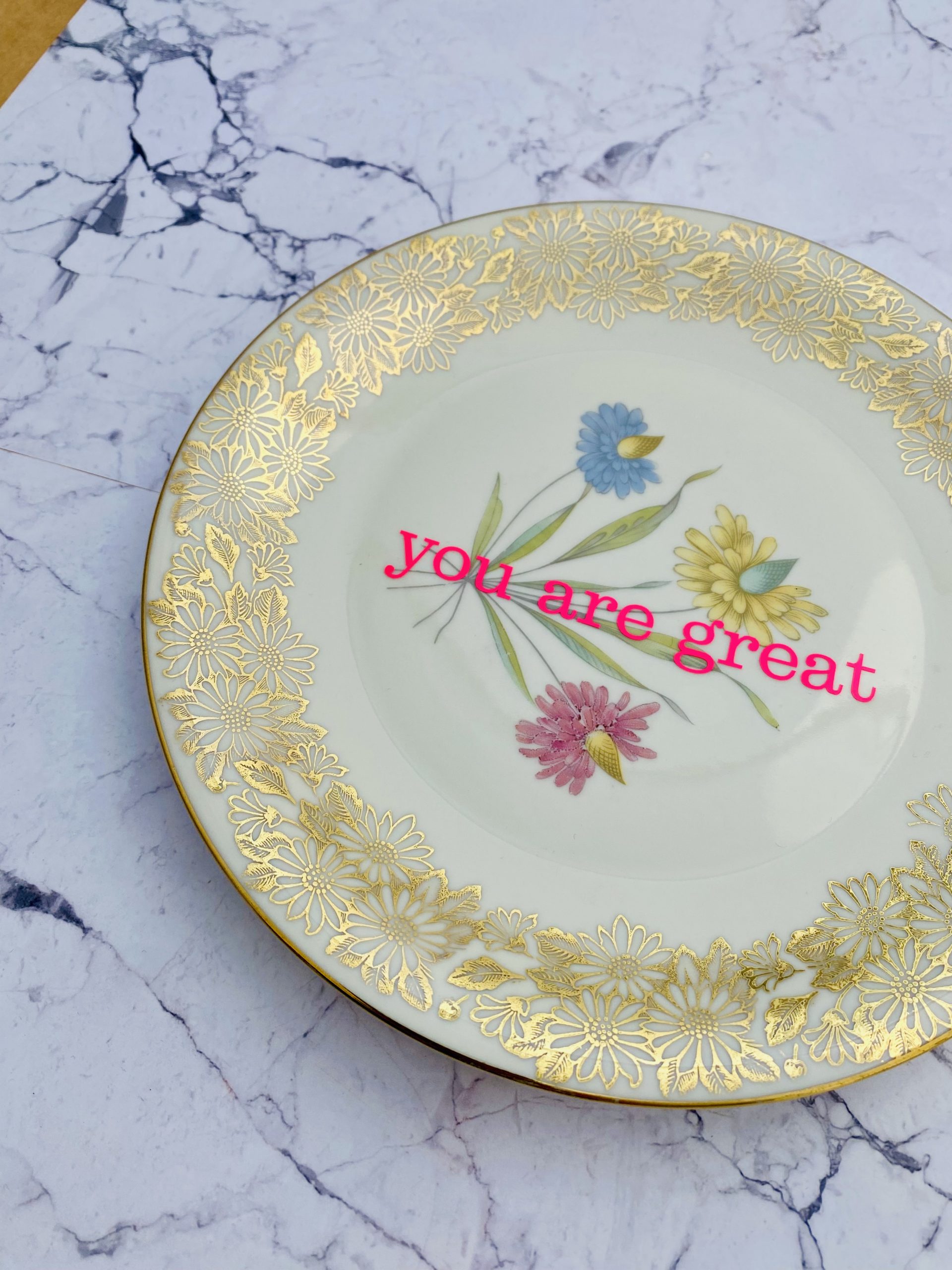 Jeder Wandteller wird handgefertigt und dieser vintage Teller ist ein Einzelstück. Dieser Wandteller hat ein schönes Blumen Decor und mit unserer you are great Typo in neonpink ( super knallig, deutlich mehr als wir auf den Fotos abbilden können :)kann er für alle Dekozwecke genutz werden.